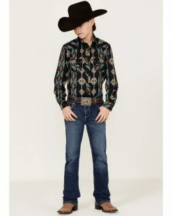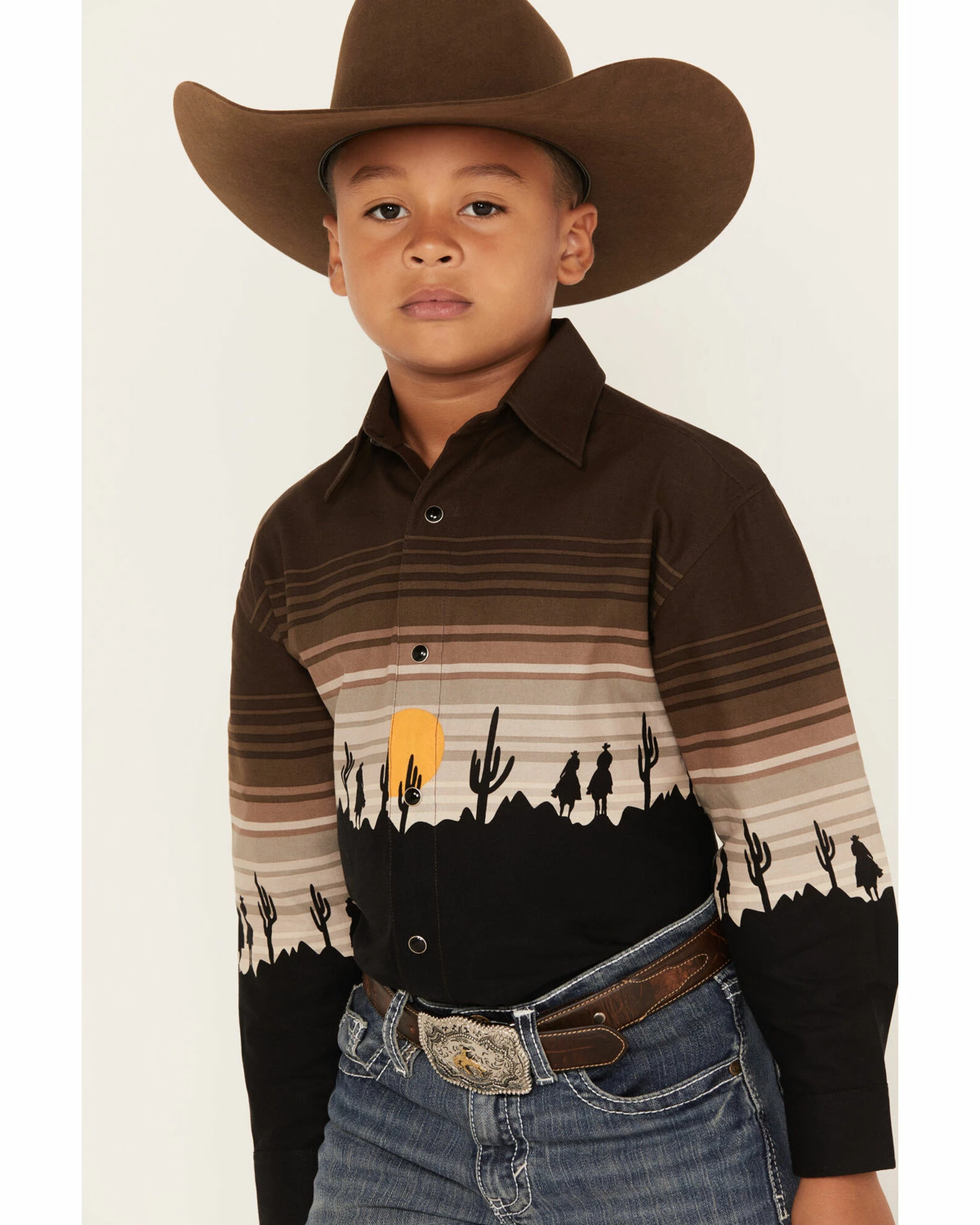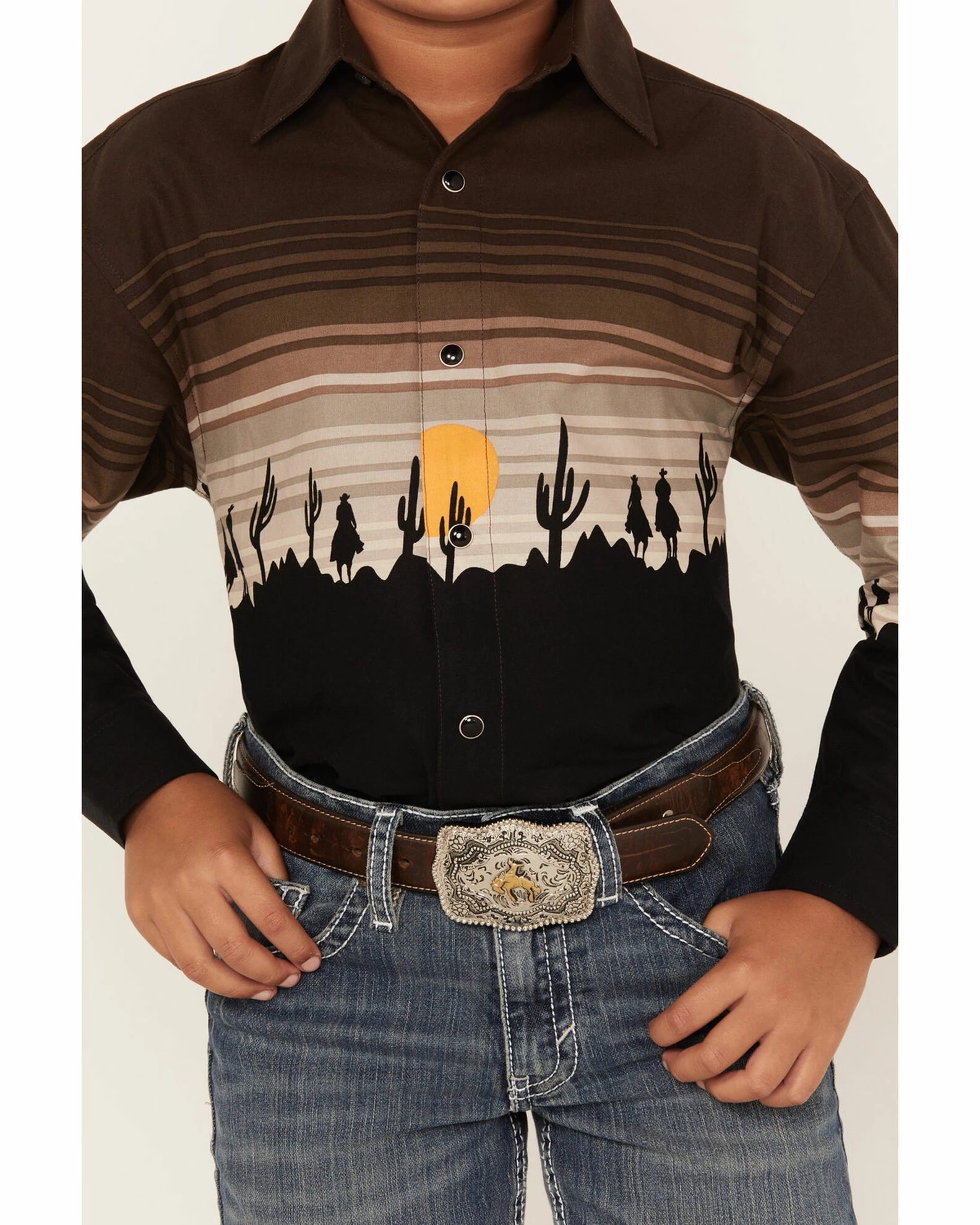 Panhandle Boys’ Cactus Sunset Border Print Long Sleeve Snap Western Shirt Black