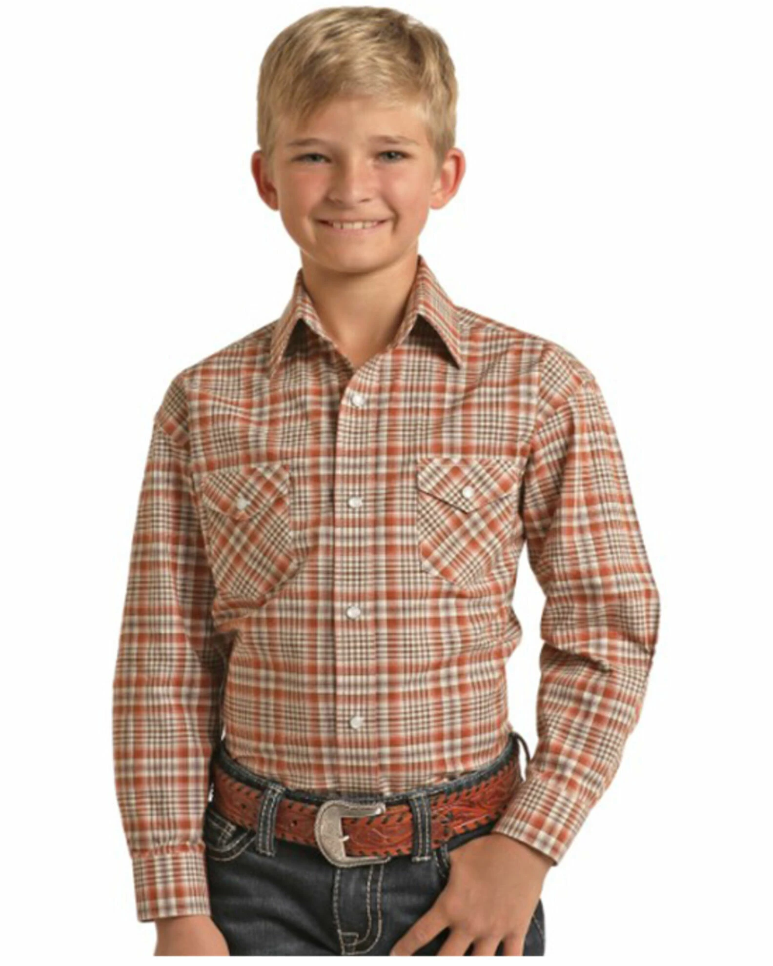 Panhandle Boys’ Plaid Print Long Sleeve Snap Stretch Western Shirt Rust Copper