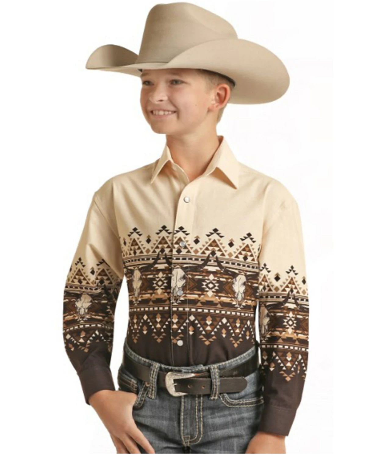 Panhandle Boys’ Steer Head Southwestern Border Print Long Sleeve Snap Shirt Natural