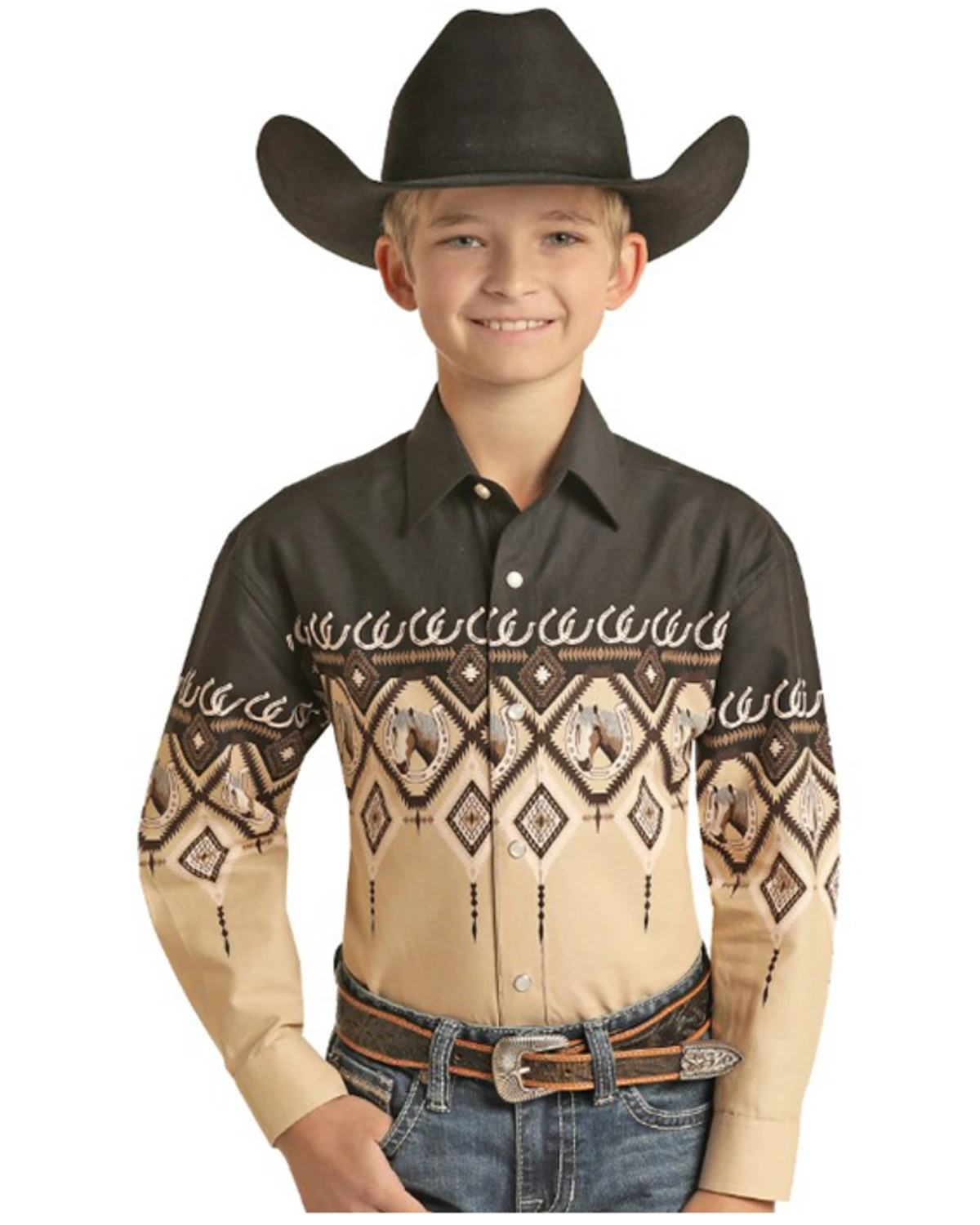Panhandle Boys’ Steers Scenic Border Print Long Sleeve Pearl Snap Western Shirt Taupe