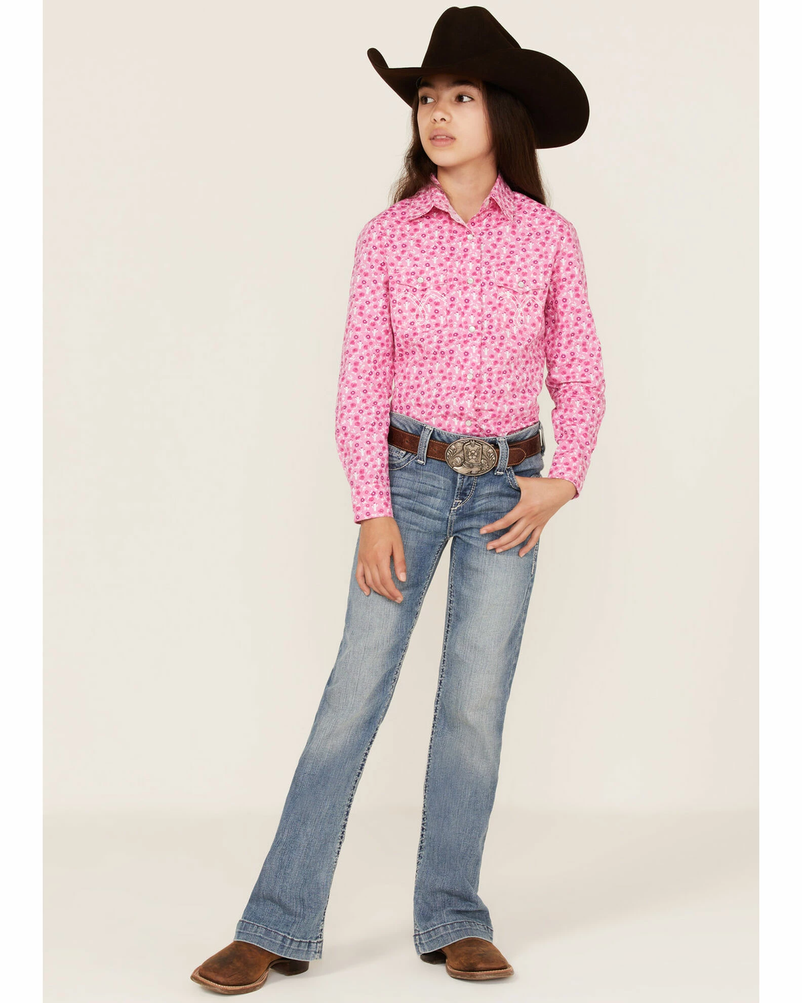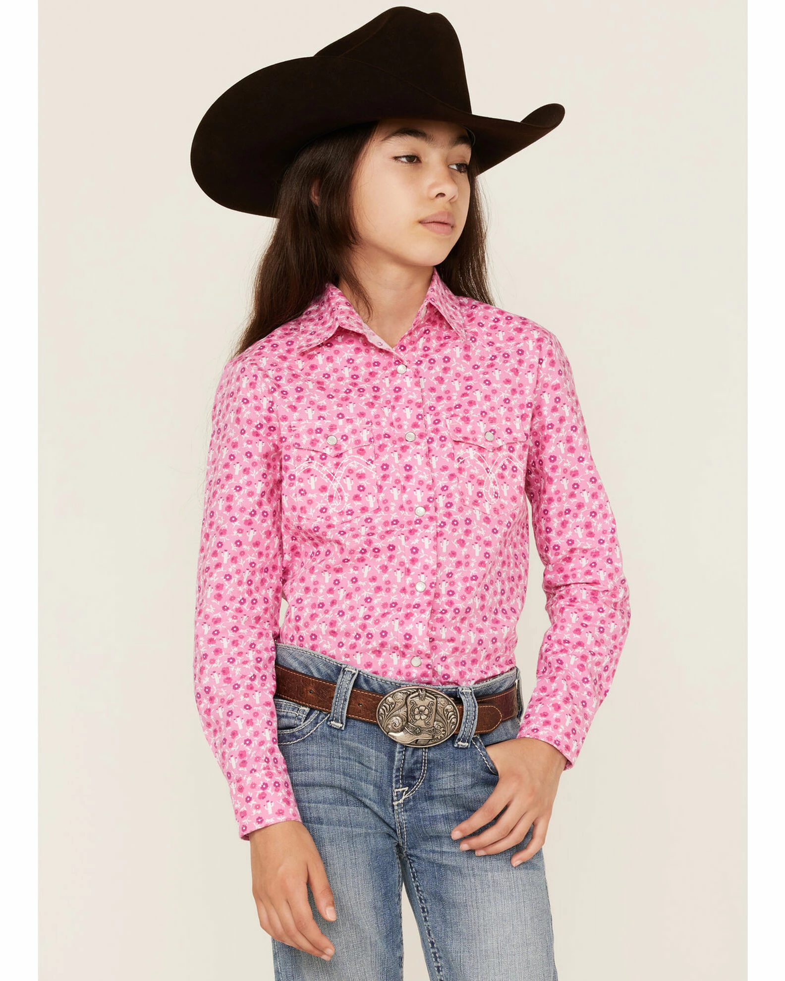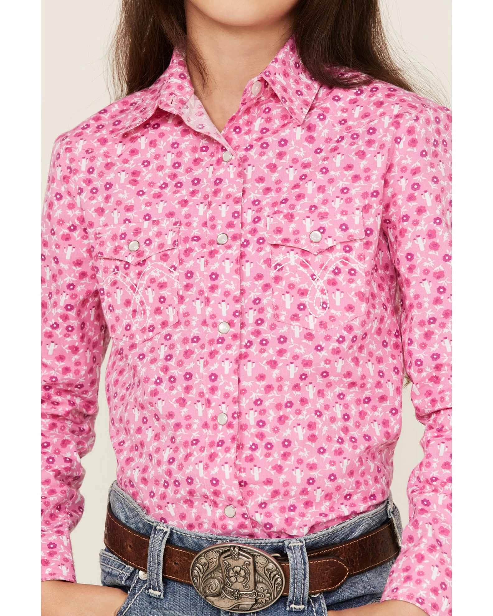 Panhandle Girls’ Cactus Floral Print Long Sleeve Western Snap Shirt Hot Pink