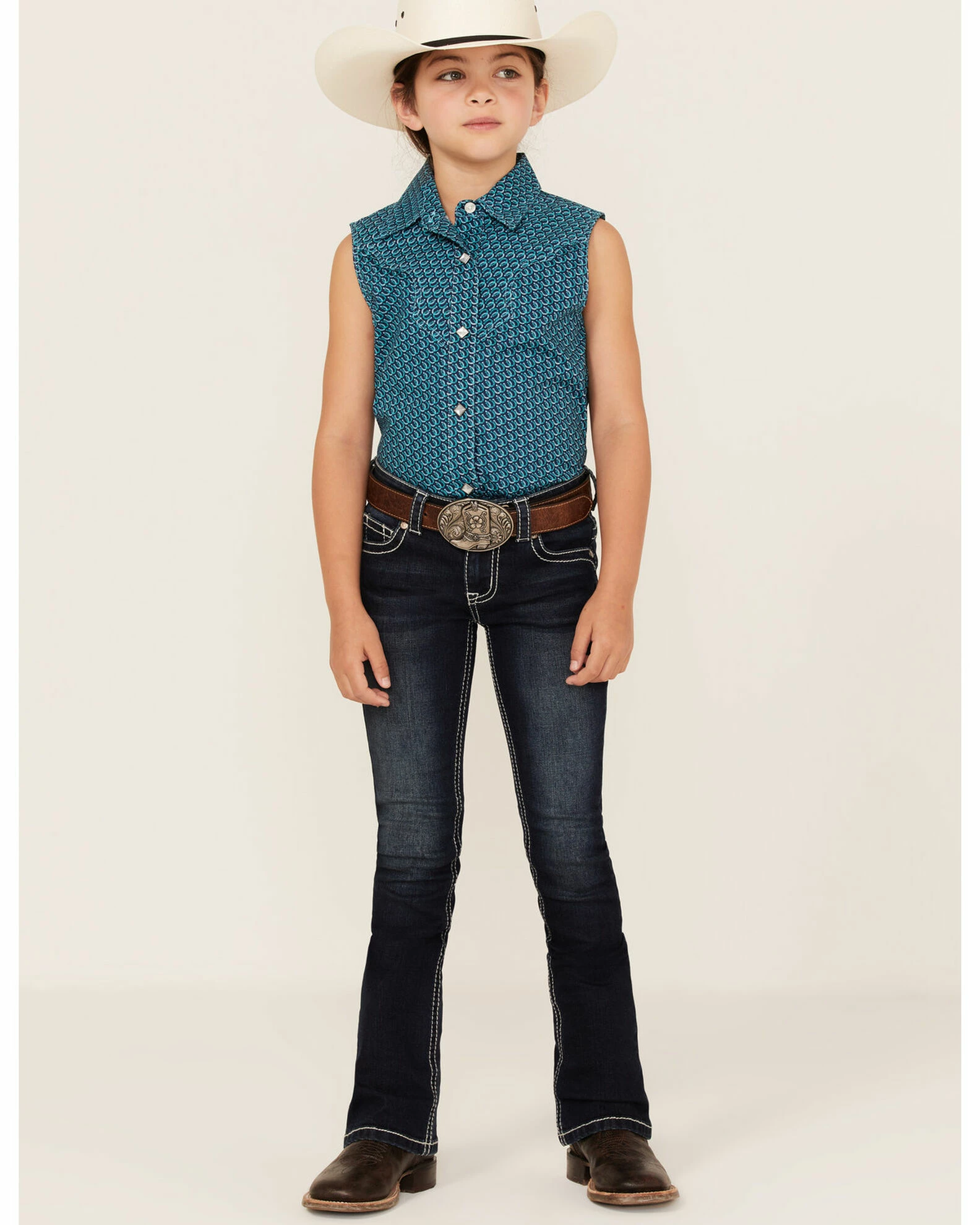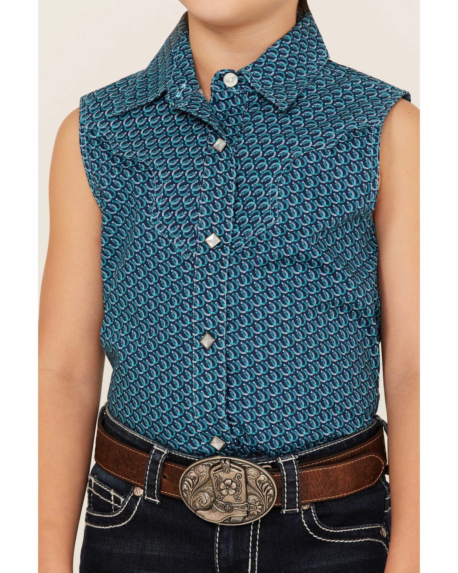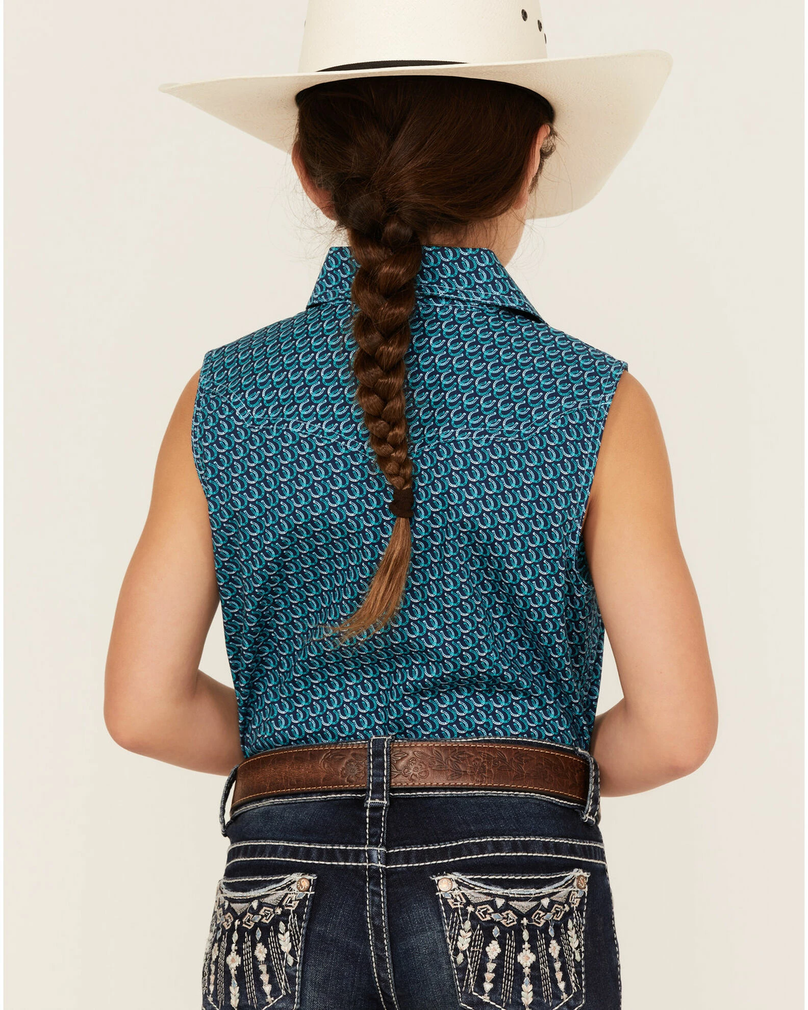 Panhandle Girls’ Horseshoe Print Sleeveless Western Snap Shirt Turquoise