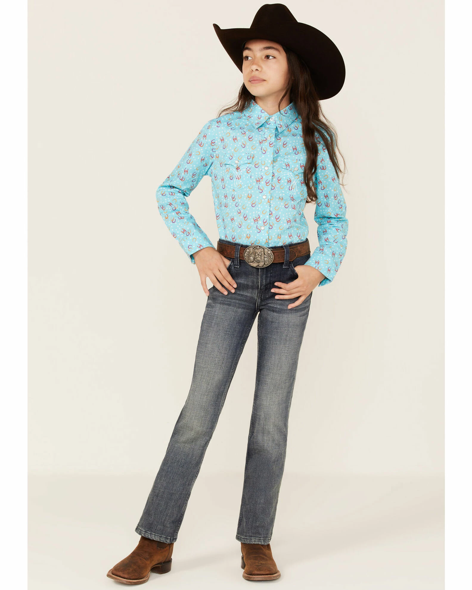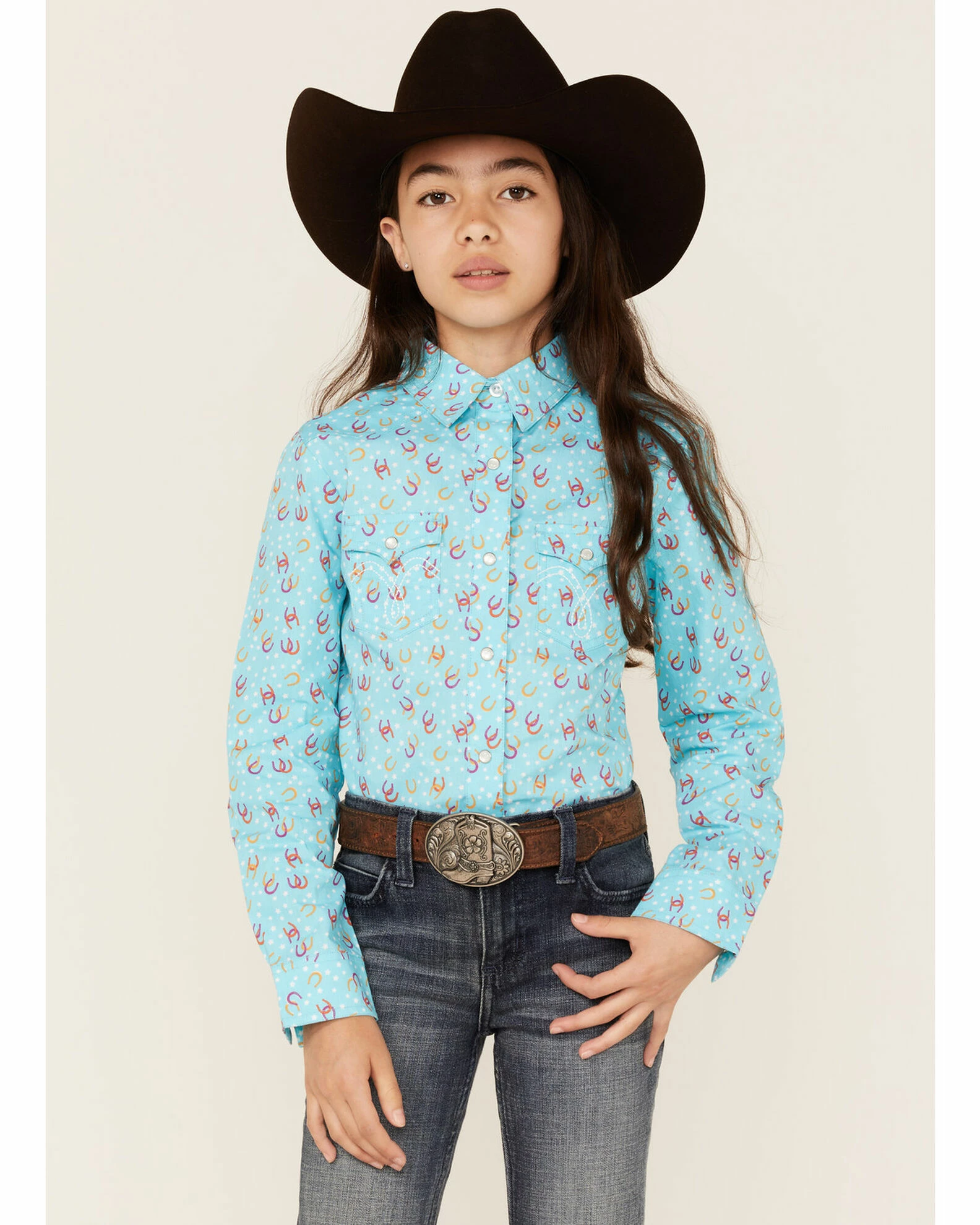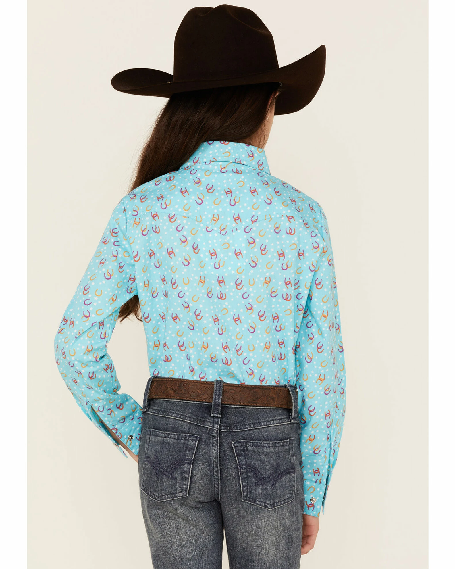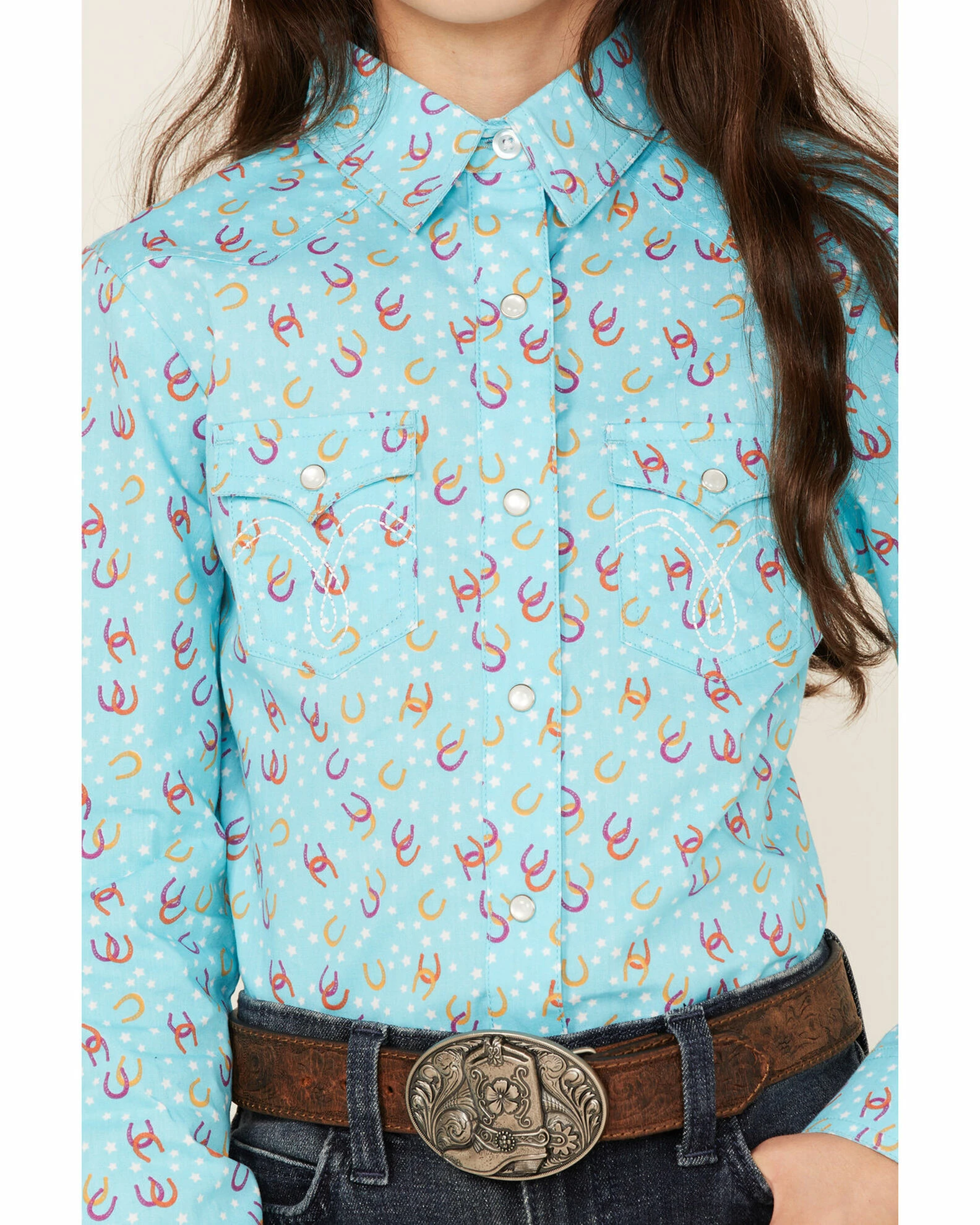 Panhandle Girls’ Horseshoe & Star Print Long Sleeve Western Snap Shirt Turquoise