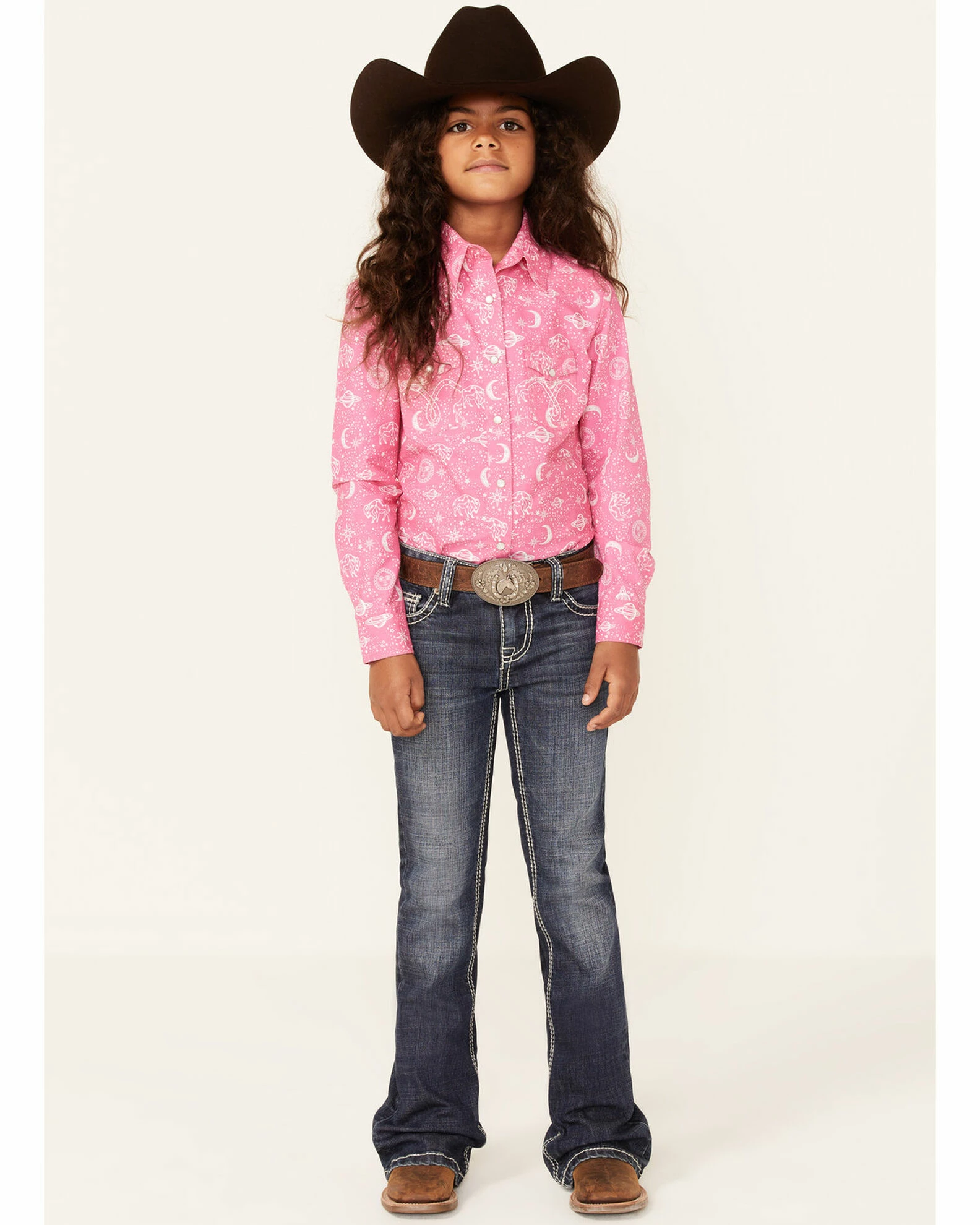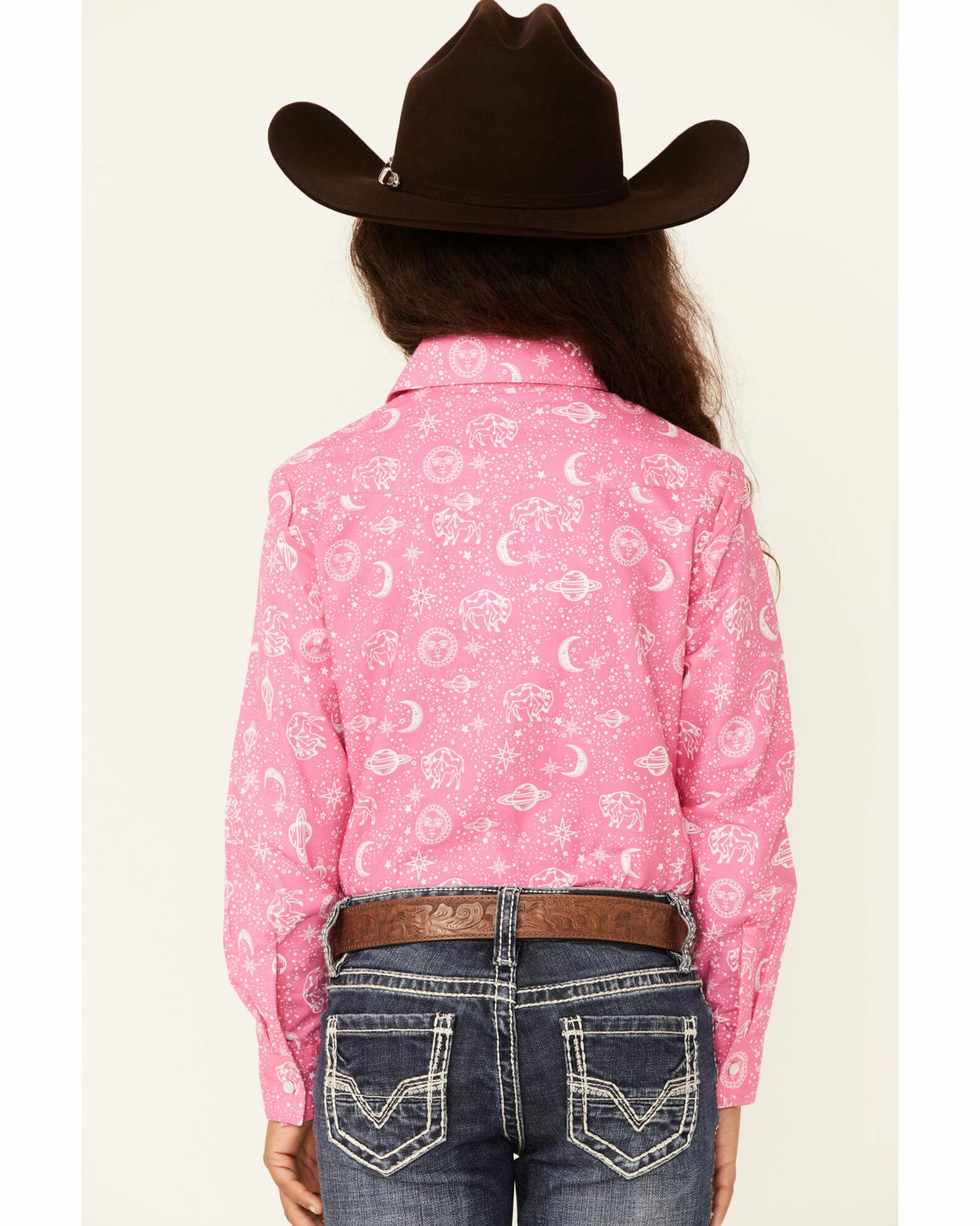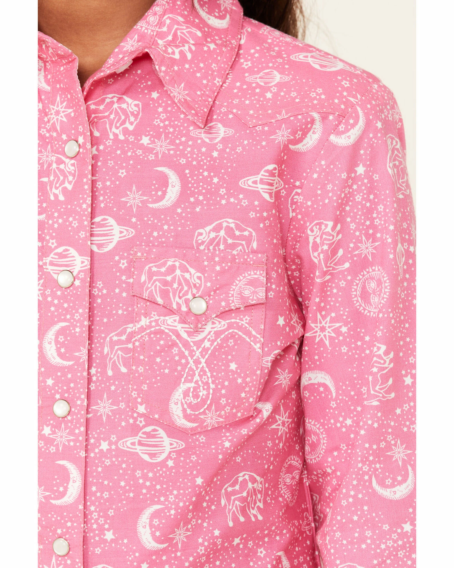 Panhandle Girls’ Pink Celestrial Print Long Sleeve Snap Western Shirt Hot Pink