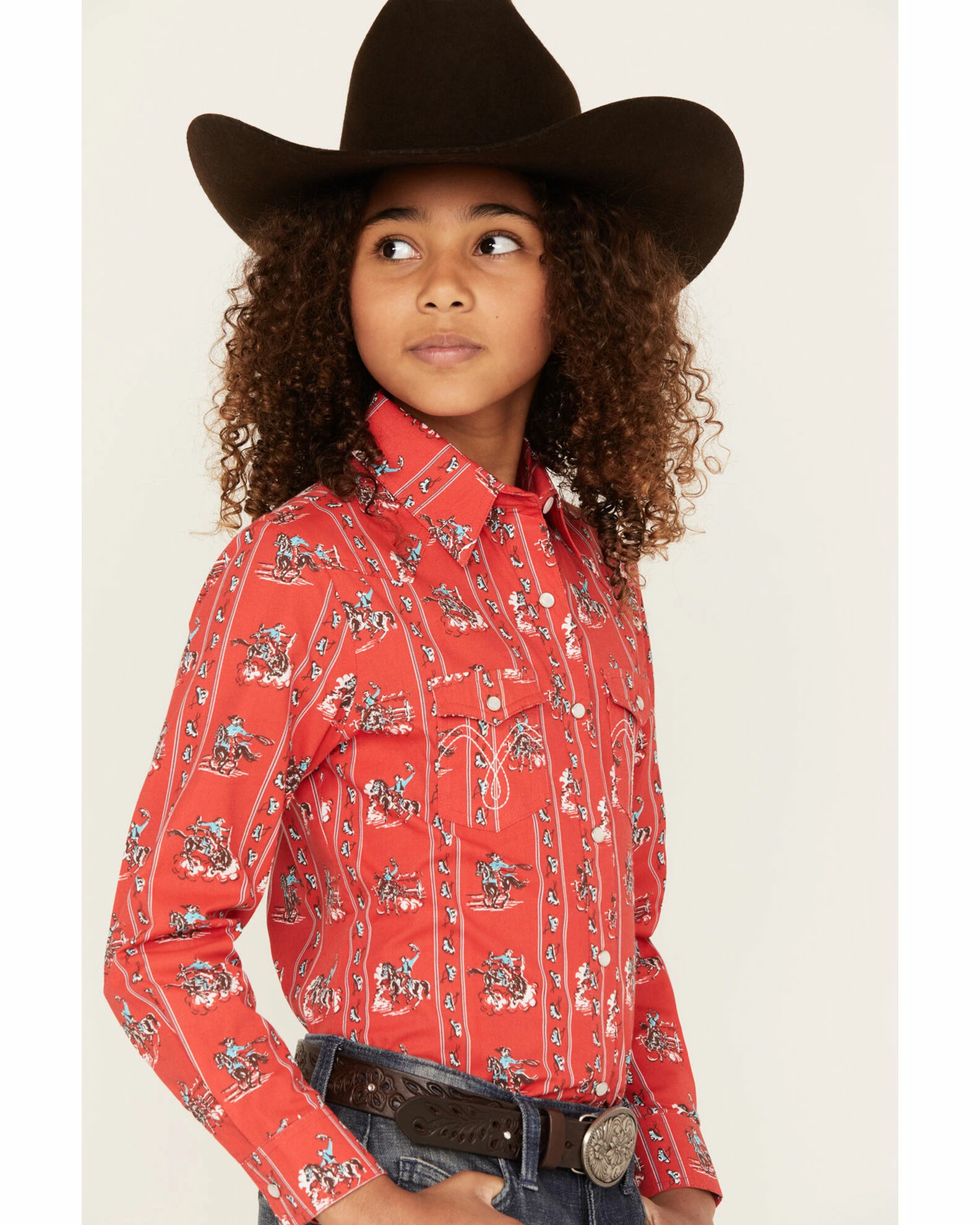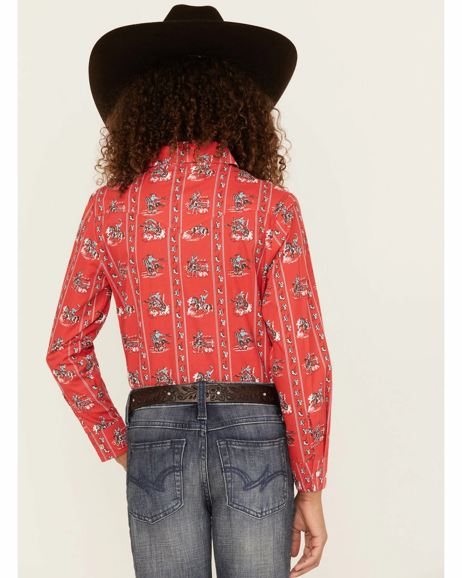 Panhandle Girls’ Striped Cowboy Print Long Sleeve Snap Western Shirt Red