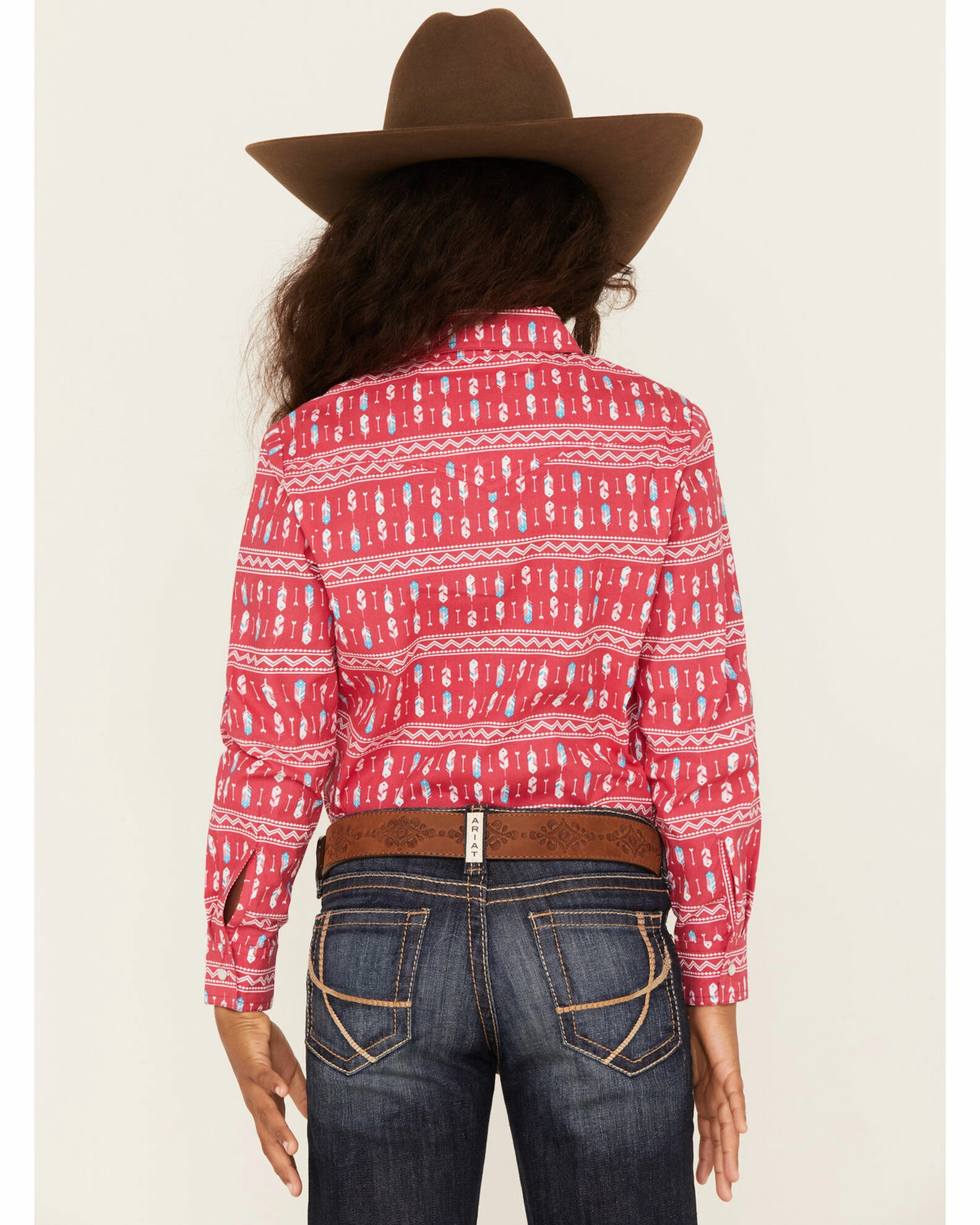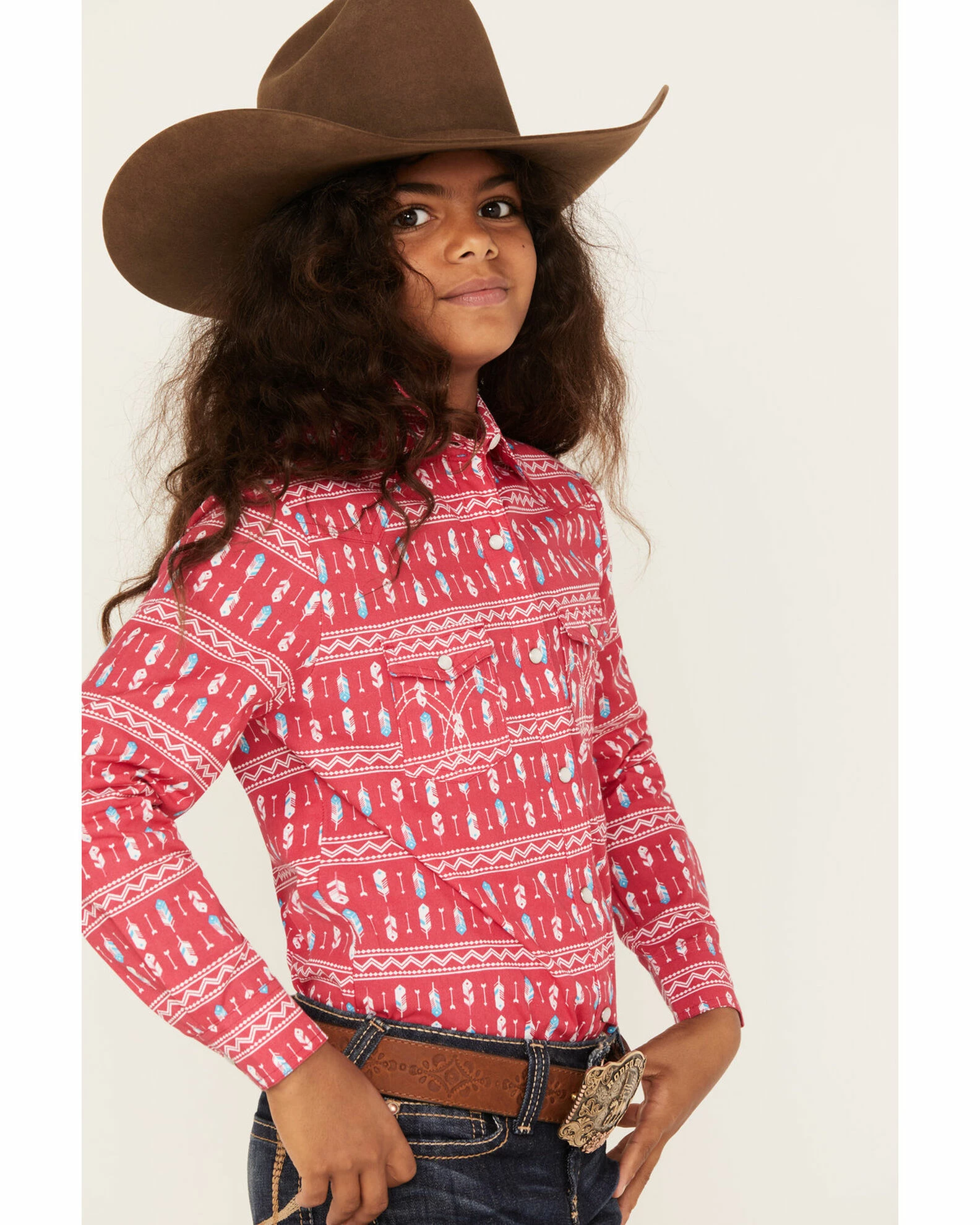 Panhandle Girls’ Striped Feather Print Long Sleeve Snap Western Shirt Pink