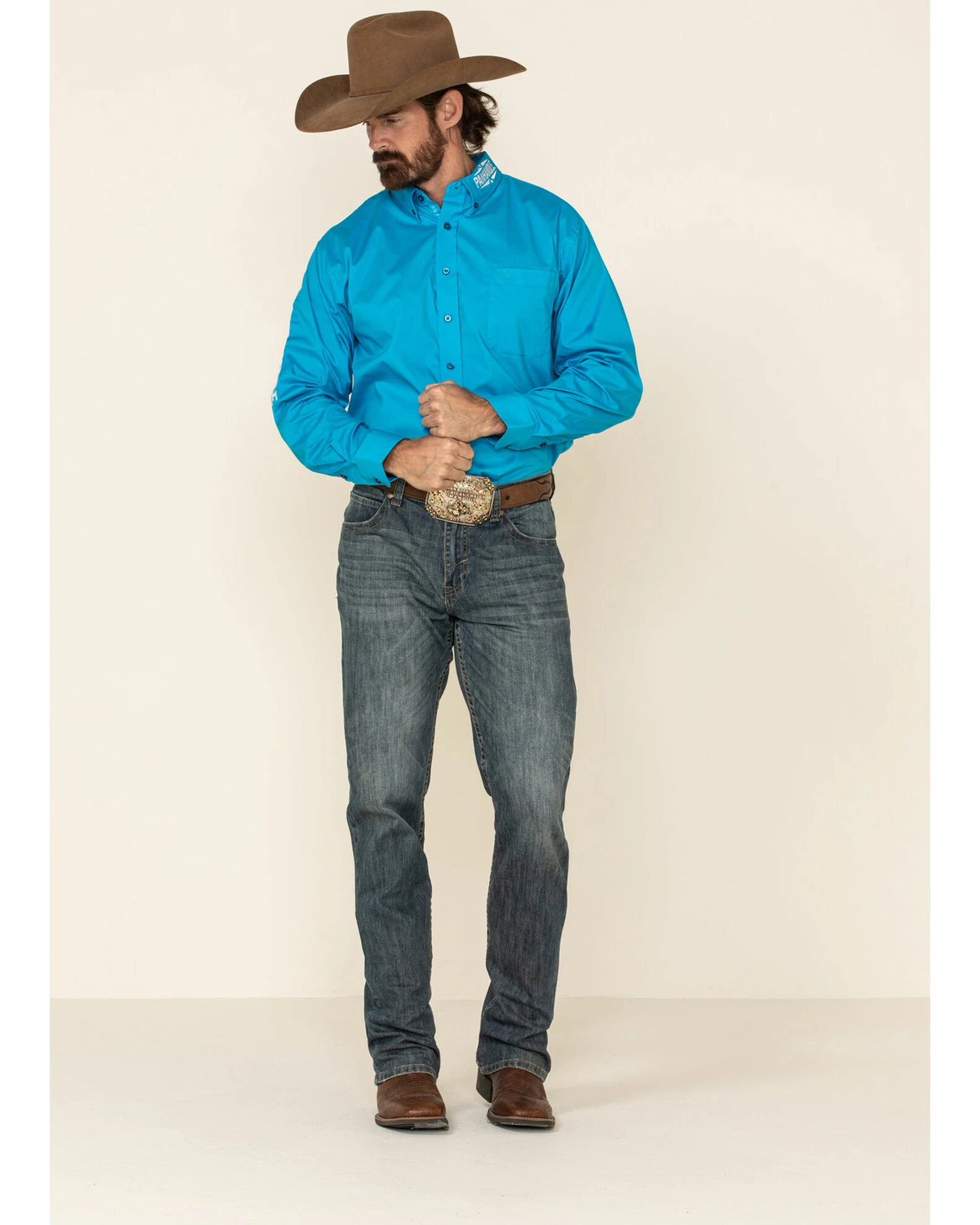 Panhandle Select Men’s Solid Embroidered Stretch Poplin Long Sleeve Western Shirt Blue