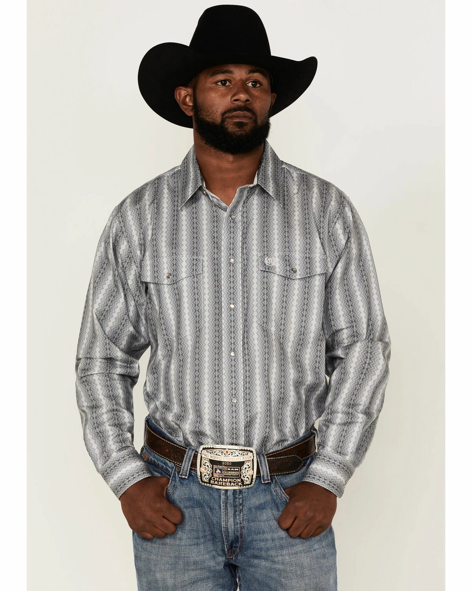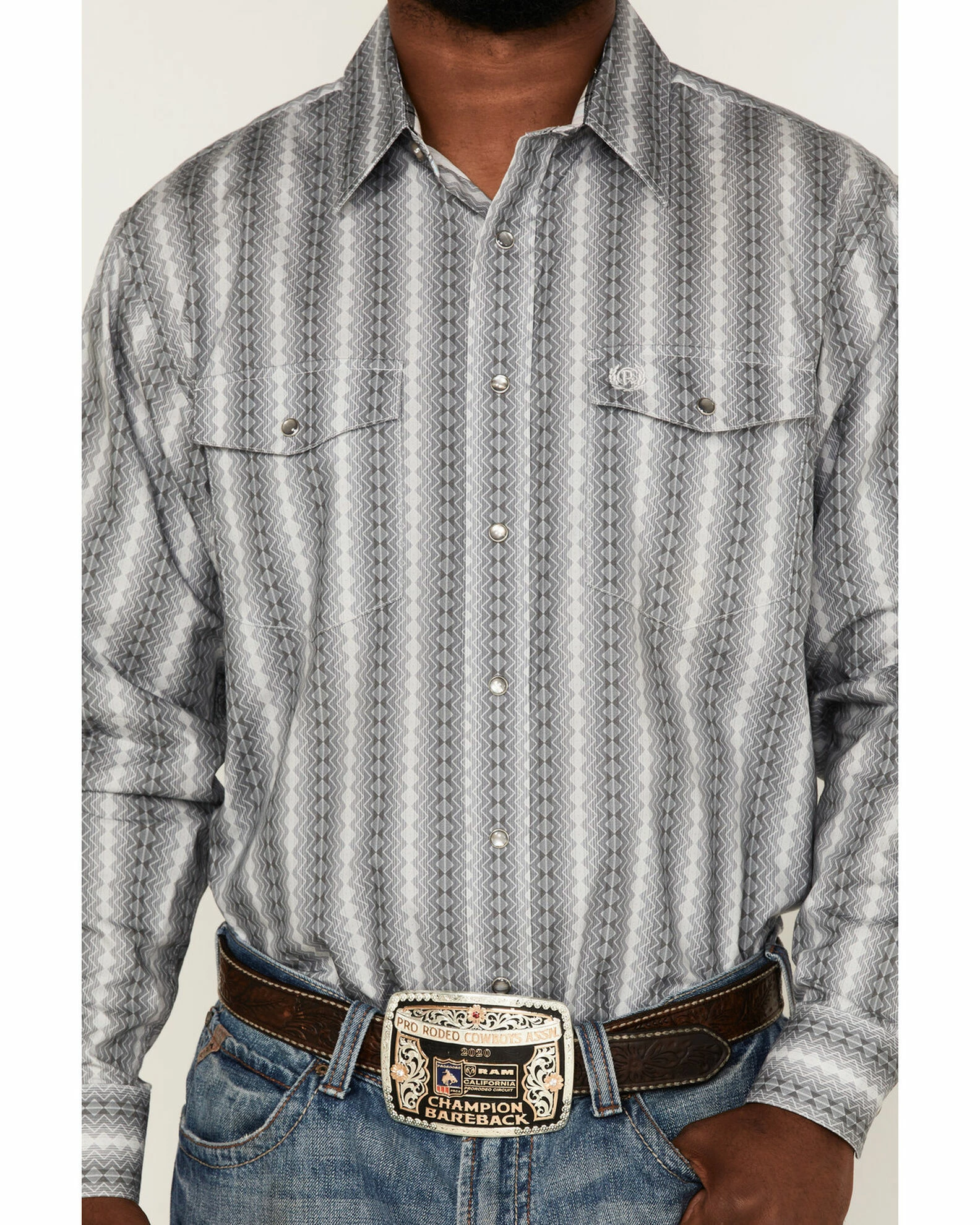 - Two western snap flap chest pockets with logo embroidery