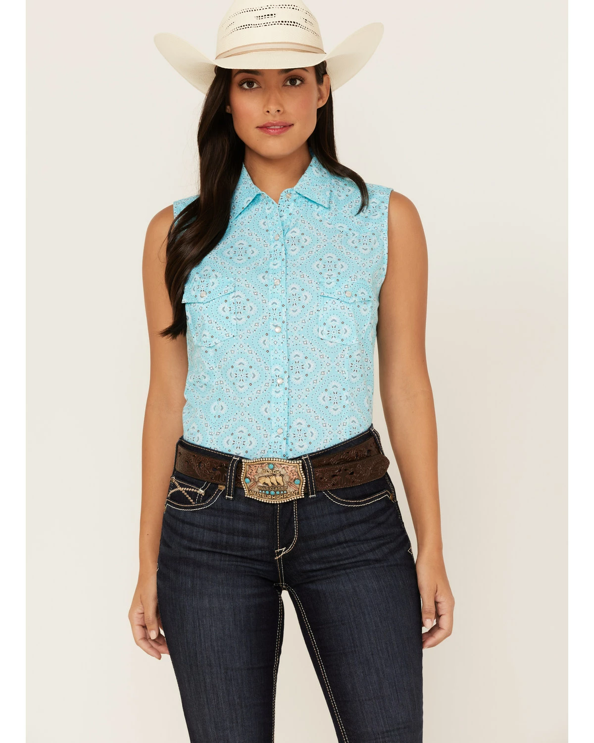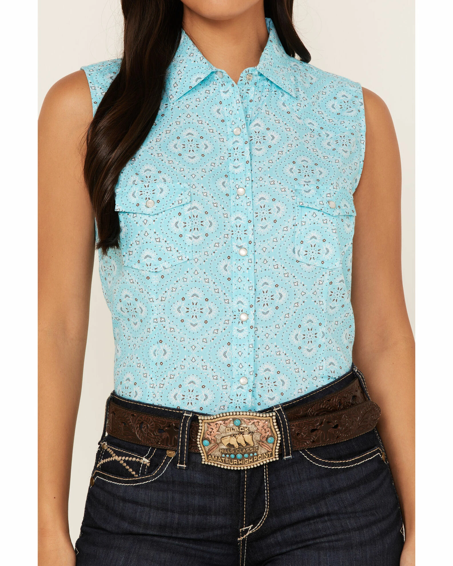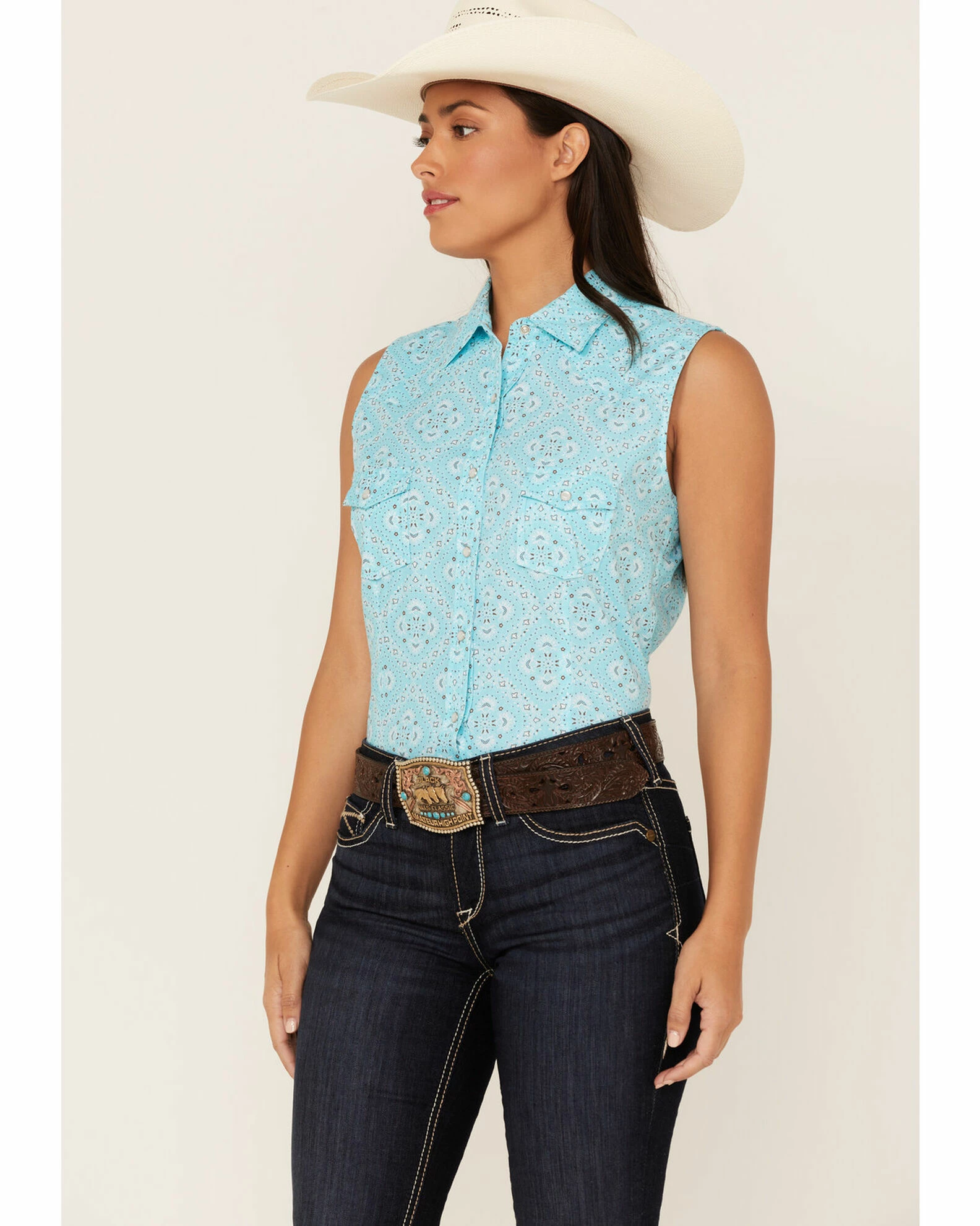 Panhandle Women’s Bandana Print Sleeveless Snap Western Shirt Blue