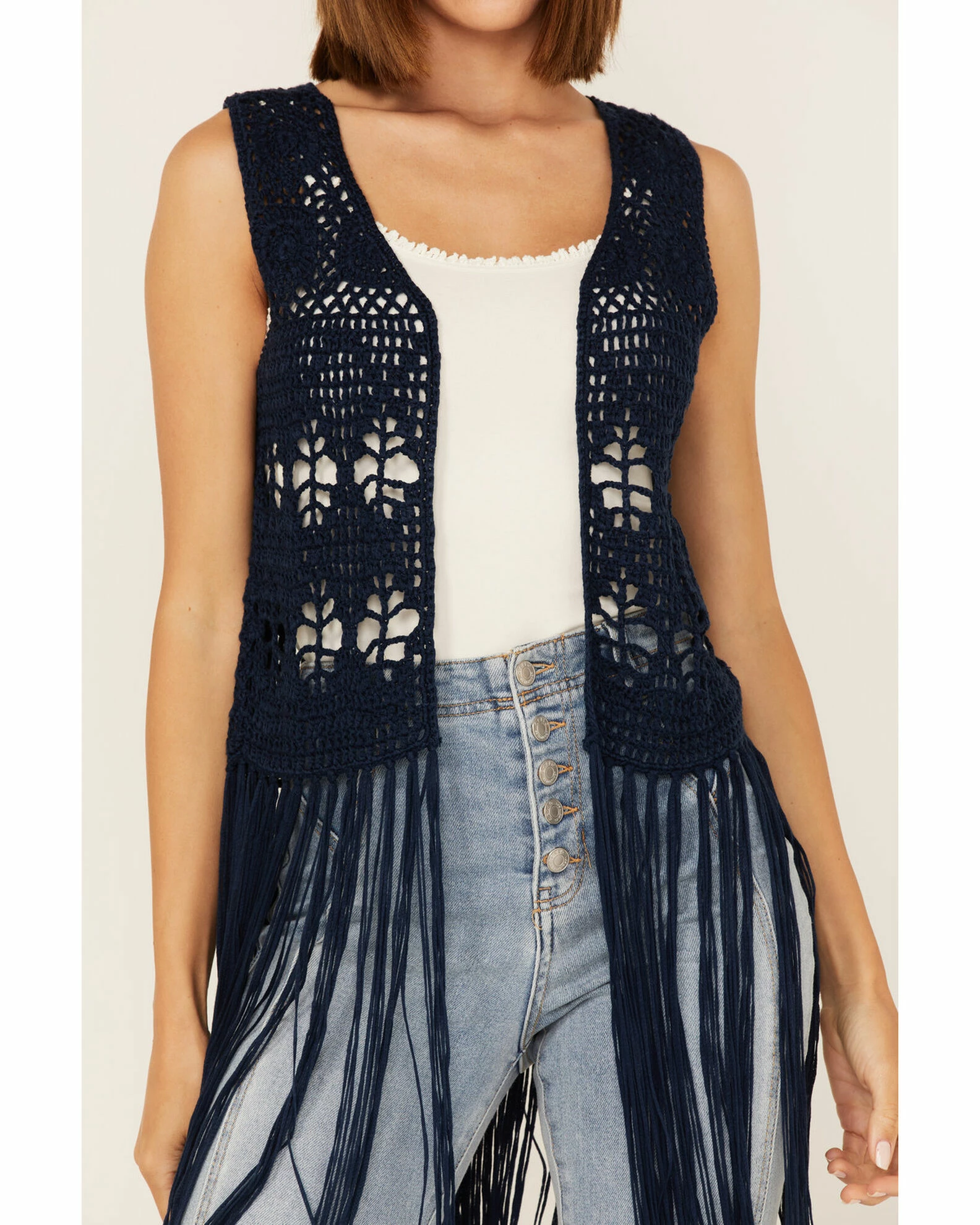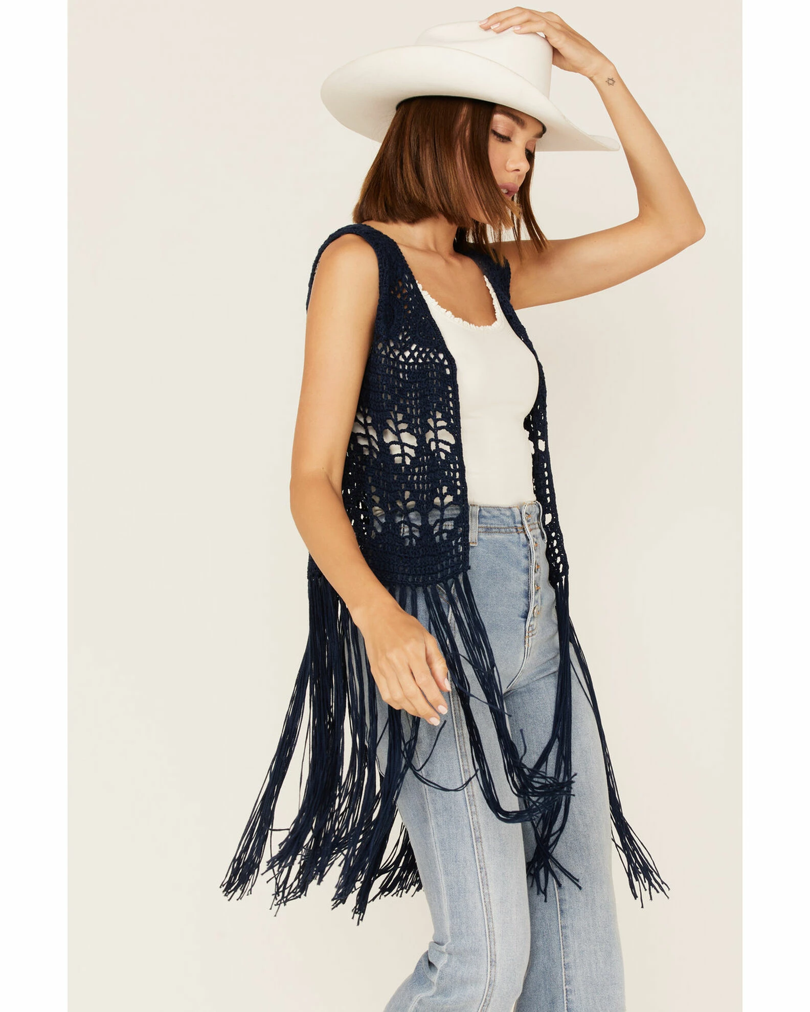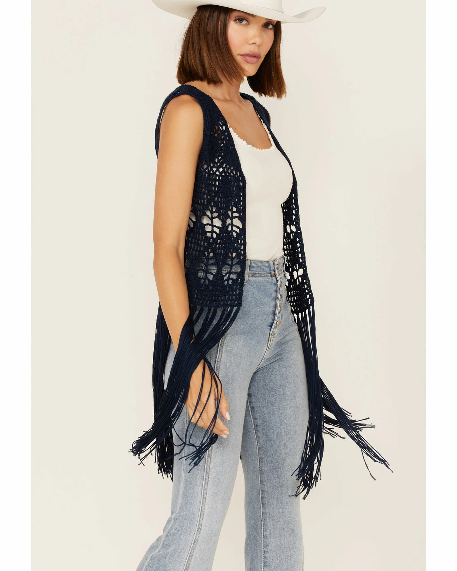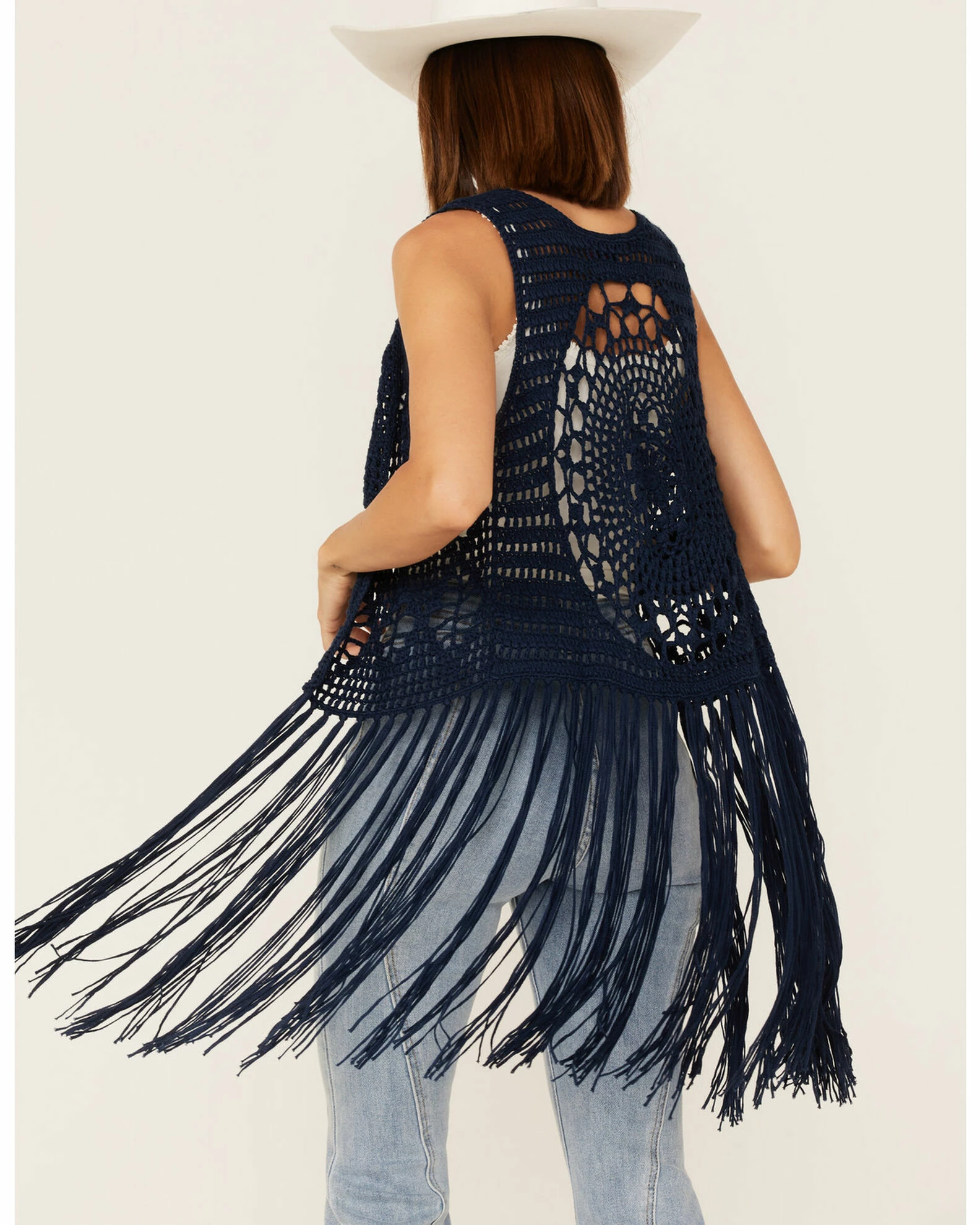 Panhandle Women’s Crochet Knit Fringe Vest Navy