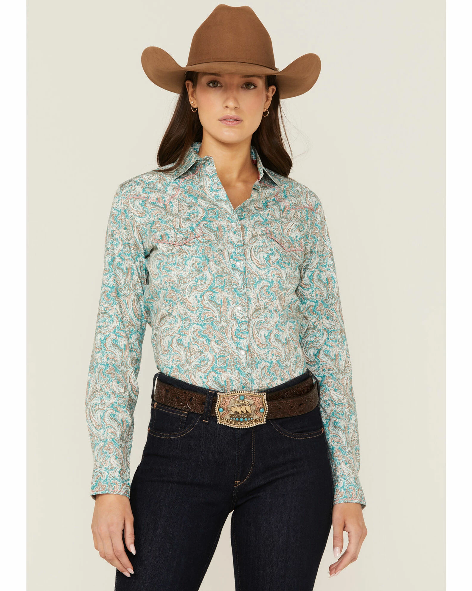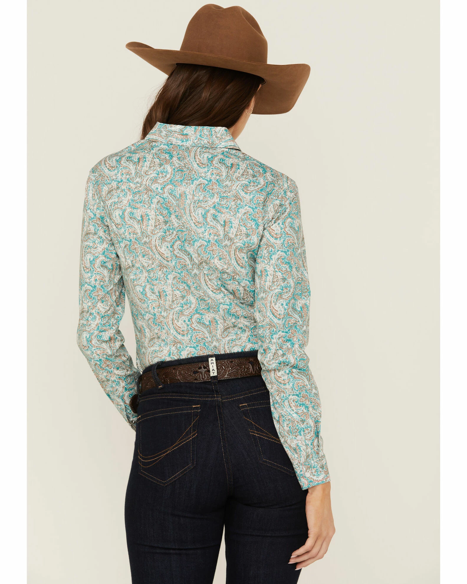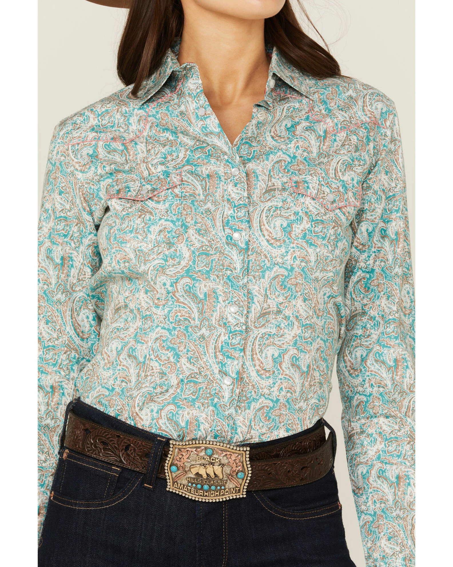 Panhandle Women’s Distressed Paisley Western Snap Shirt Teal