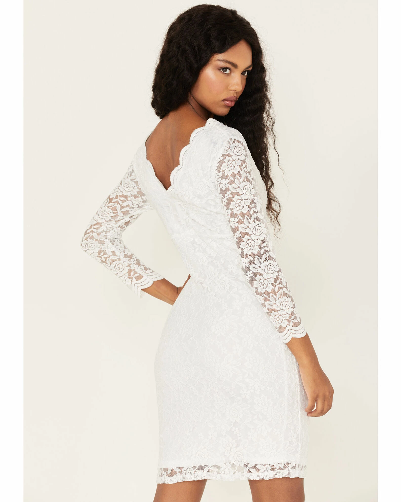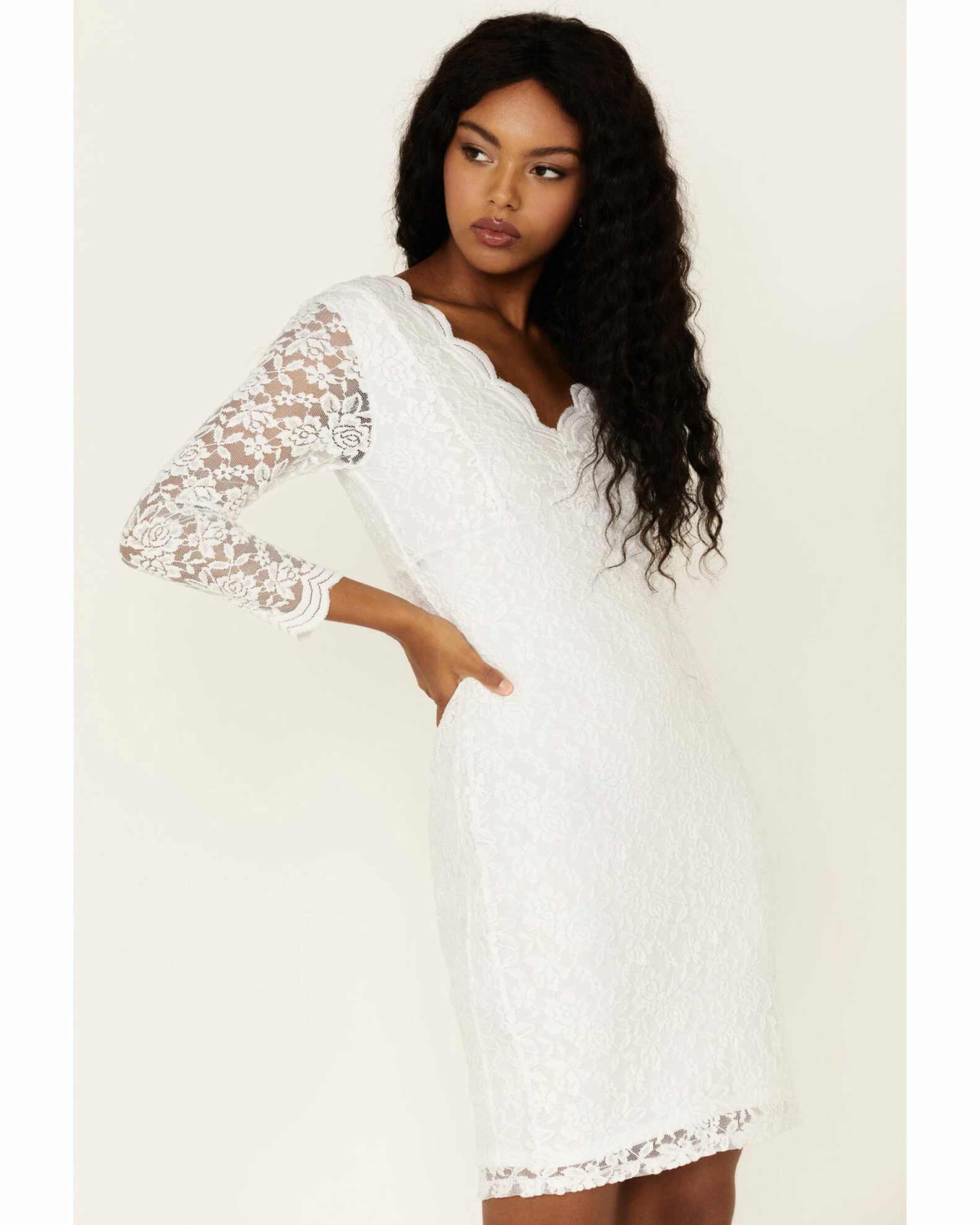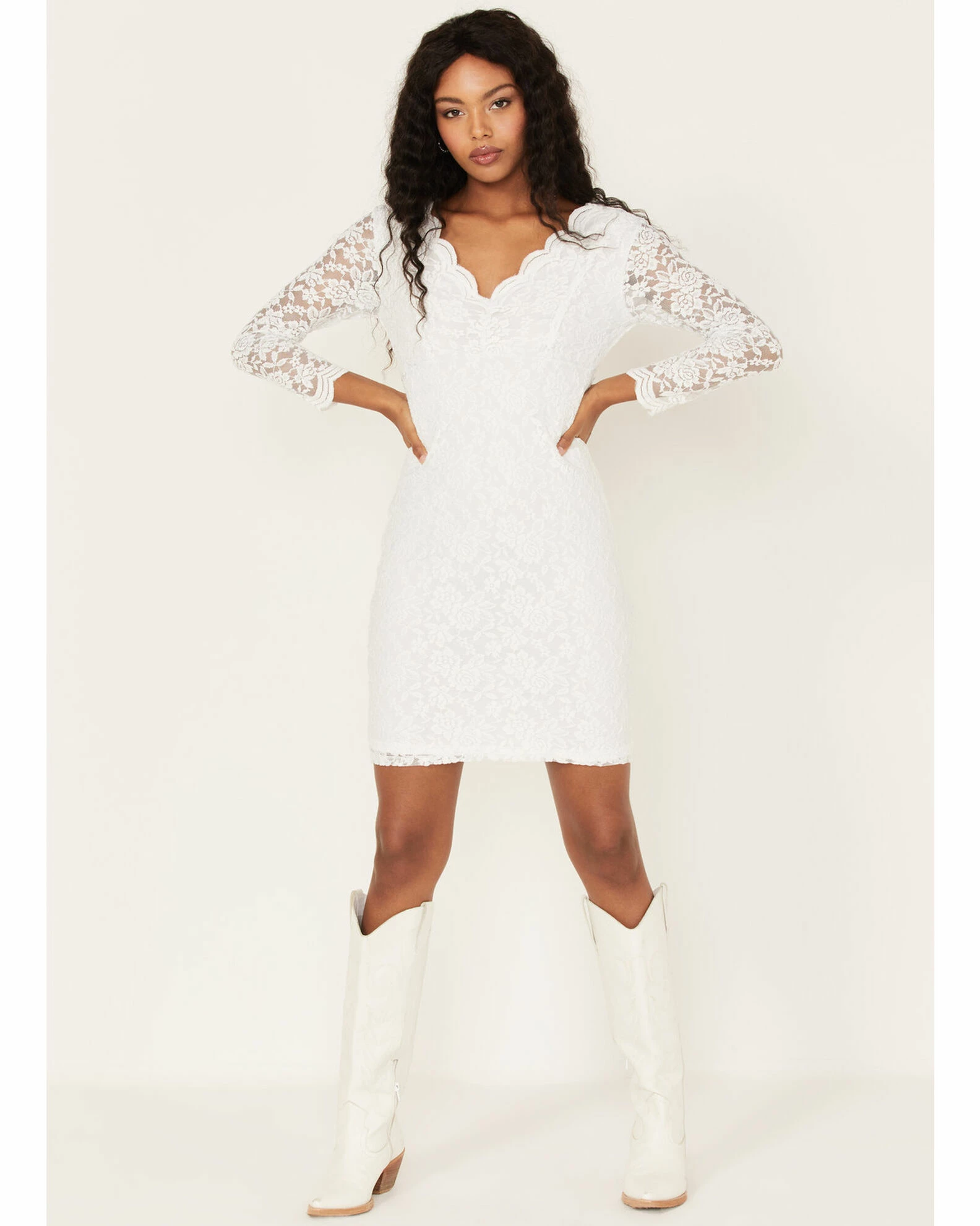 - Scalloped trim on neck and cuffs