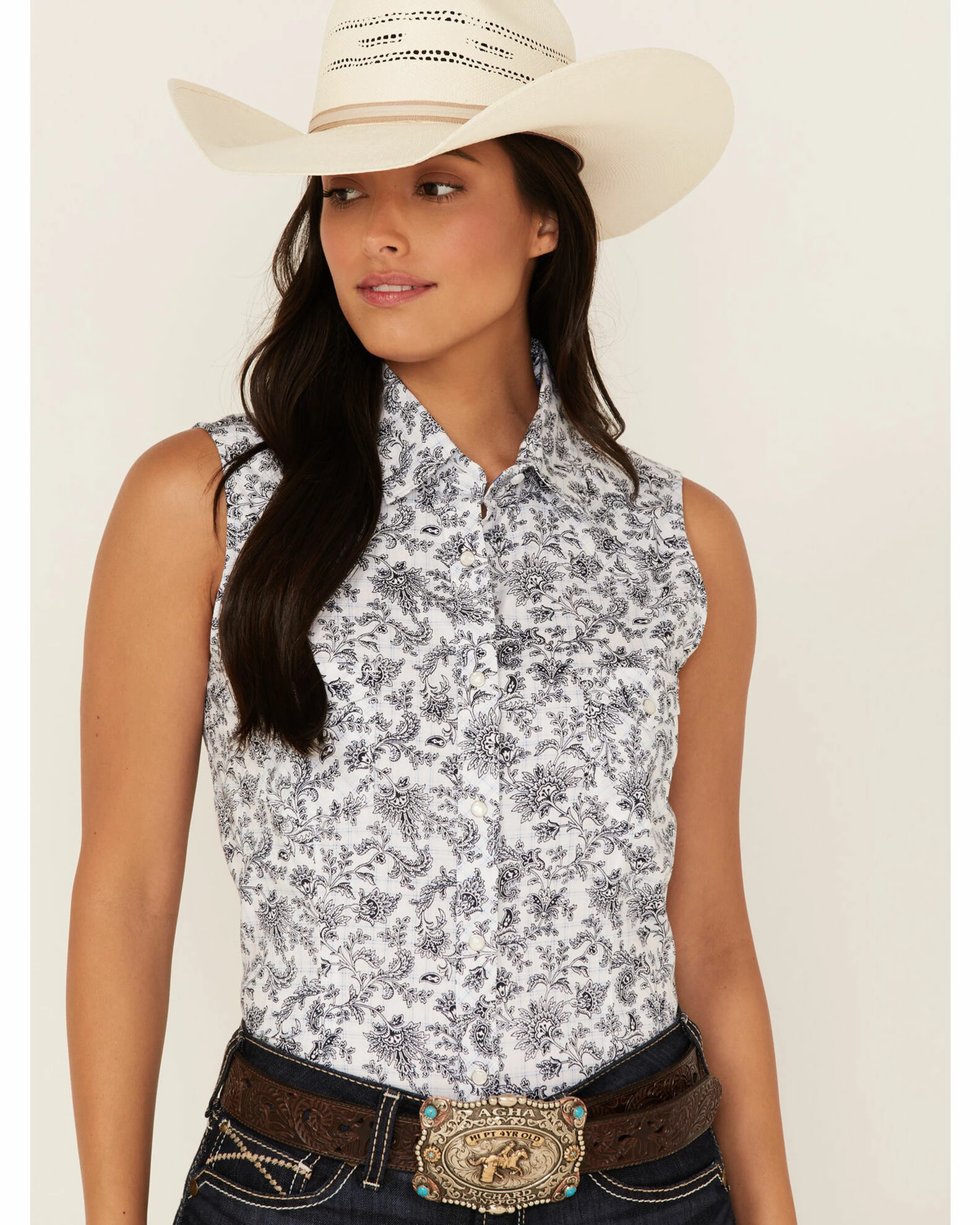 Panhandle Women’s Floral Paisley Print Sleeveless Snap Western Core Shirt White