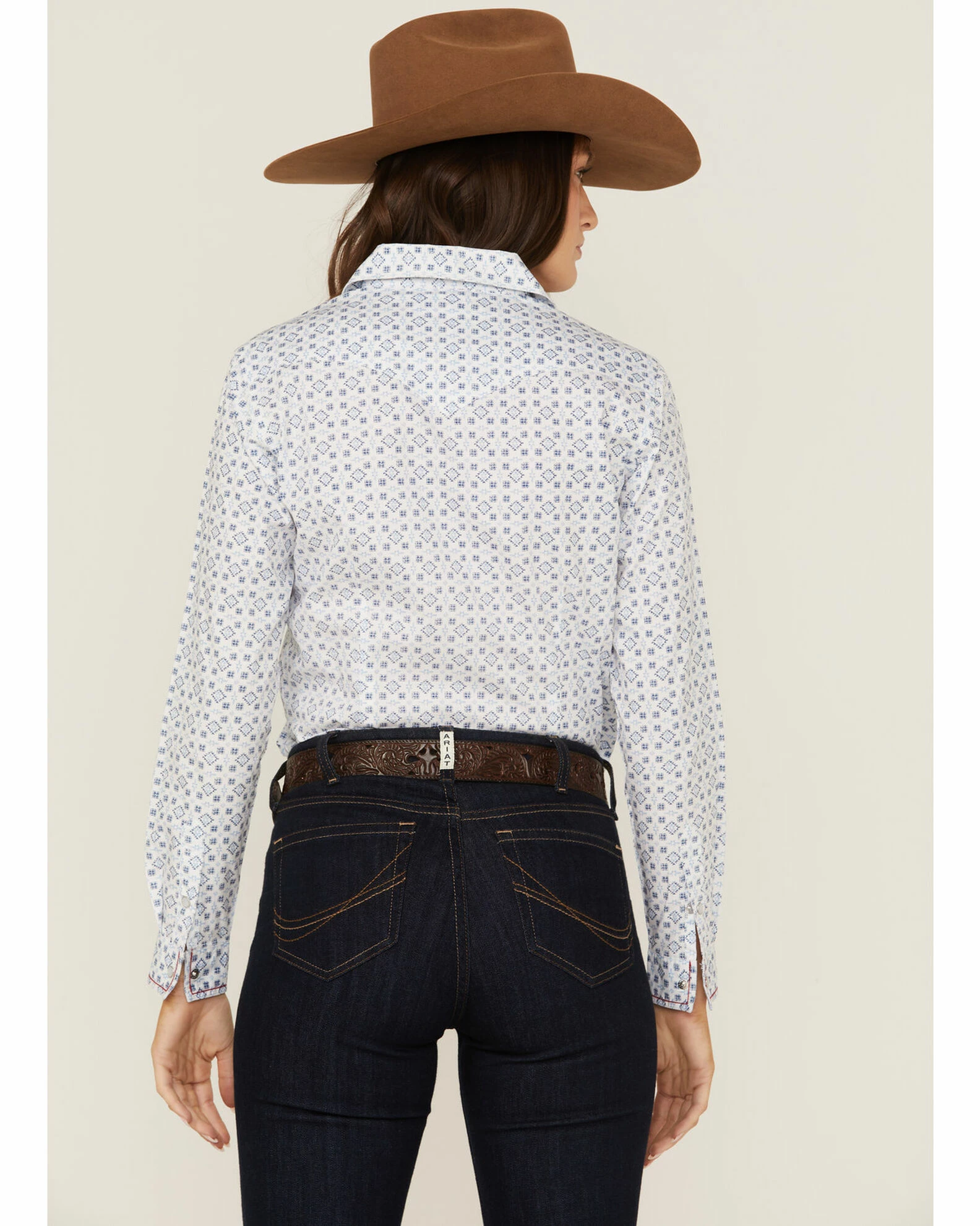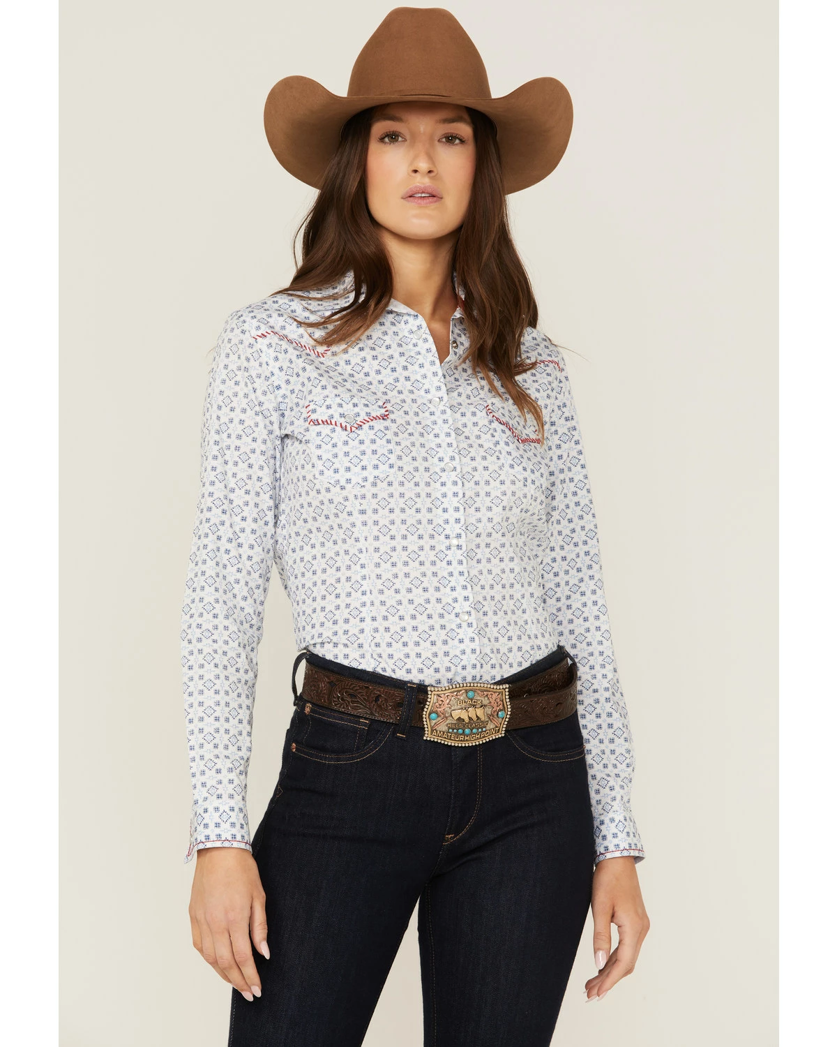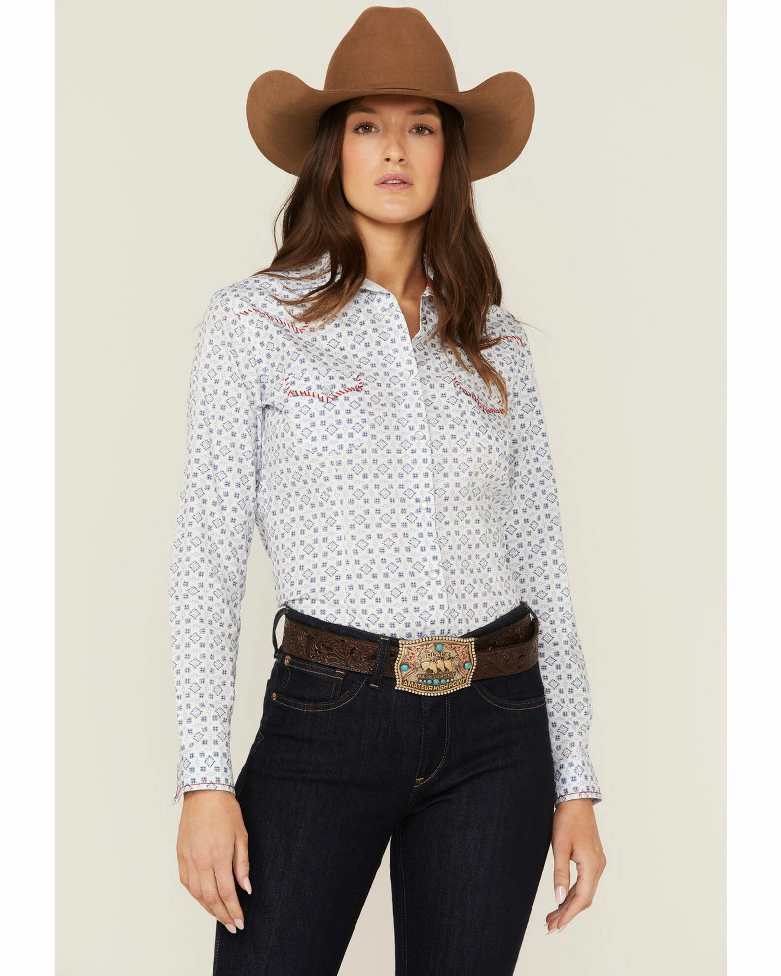 Panhandle Women’s Mini Southwestern Geo Whipstitch Long Sleeve Western Shirt Blue