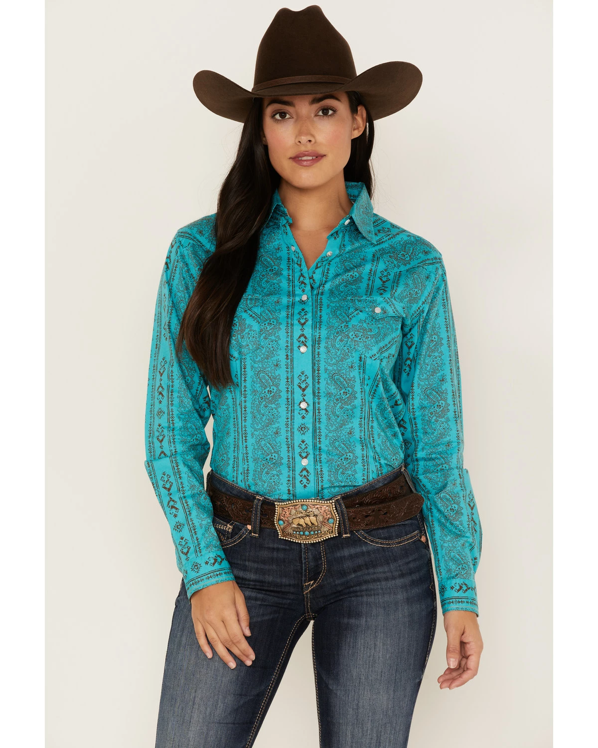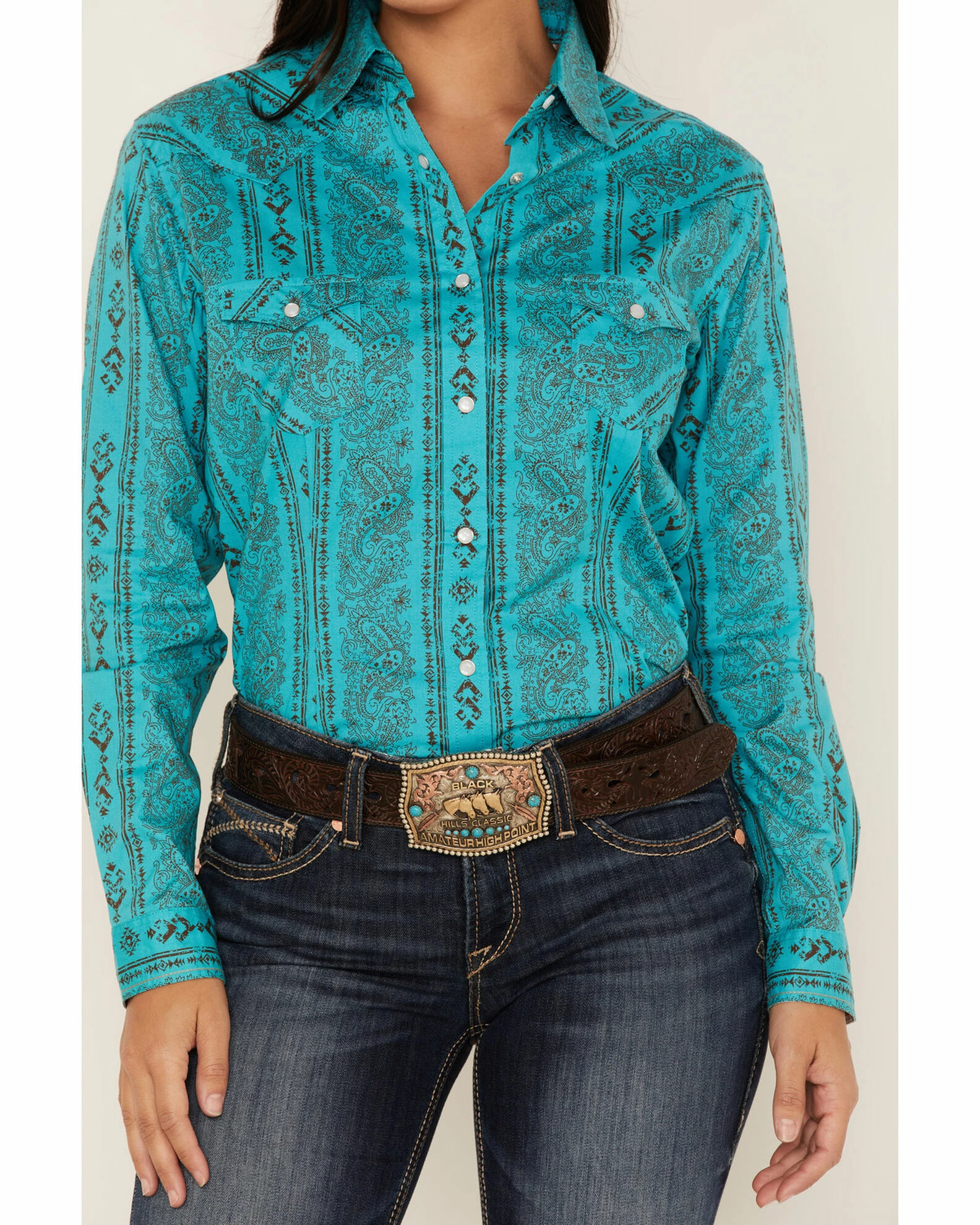 Panhandle Women’s Paisley Print Long Sleeve Snap Stretch Western Shirt Turquoise