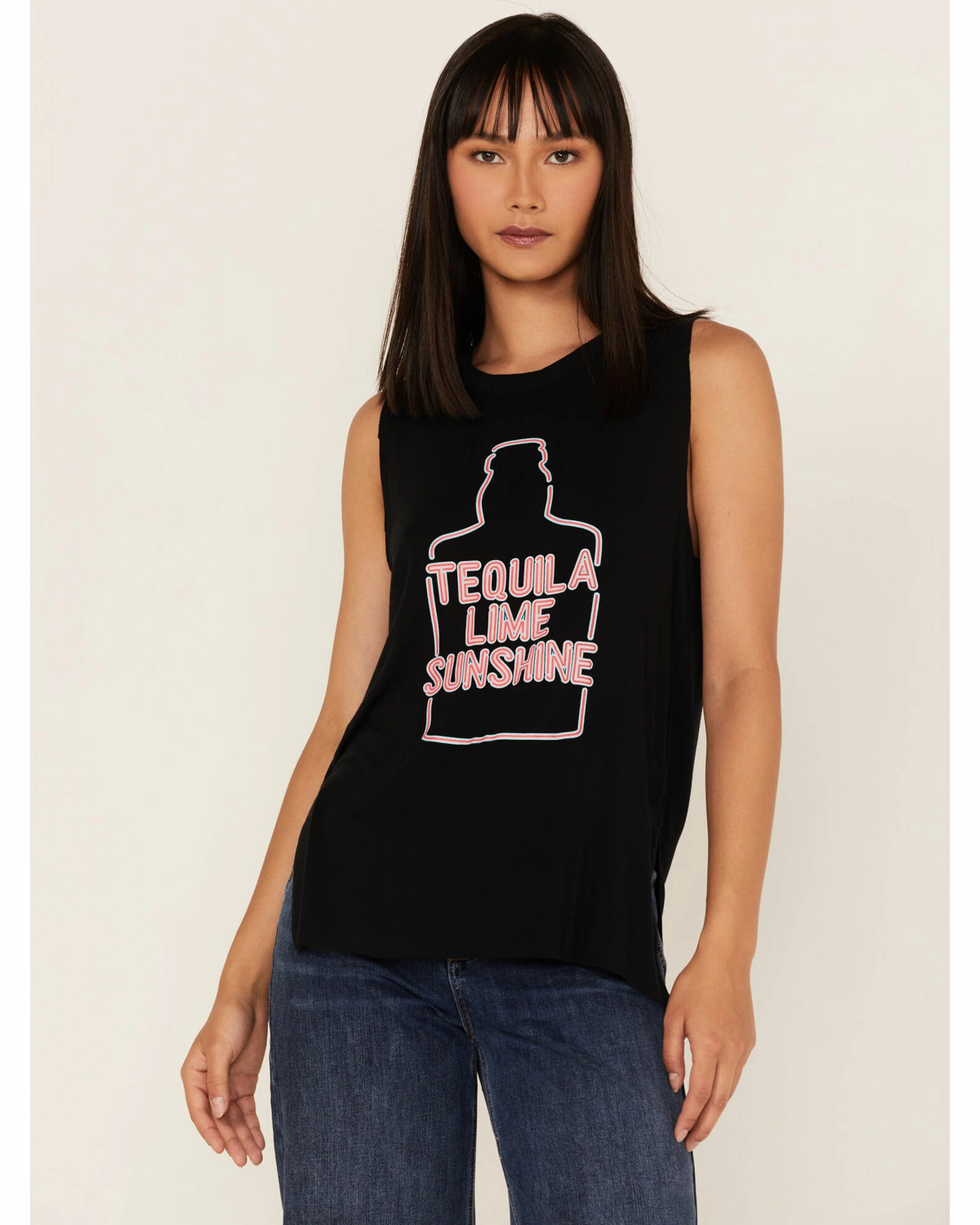 - Black with “Tequila Lime Sunshine” neon light bottle graphic on front