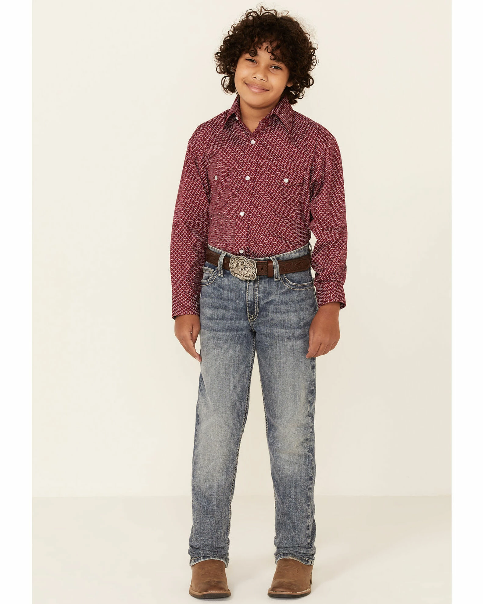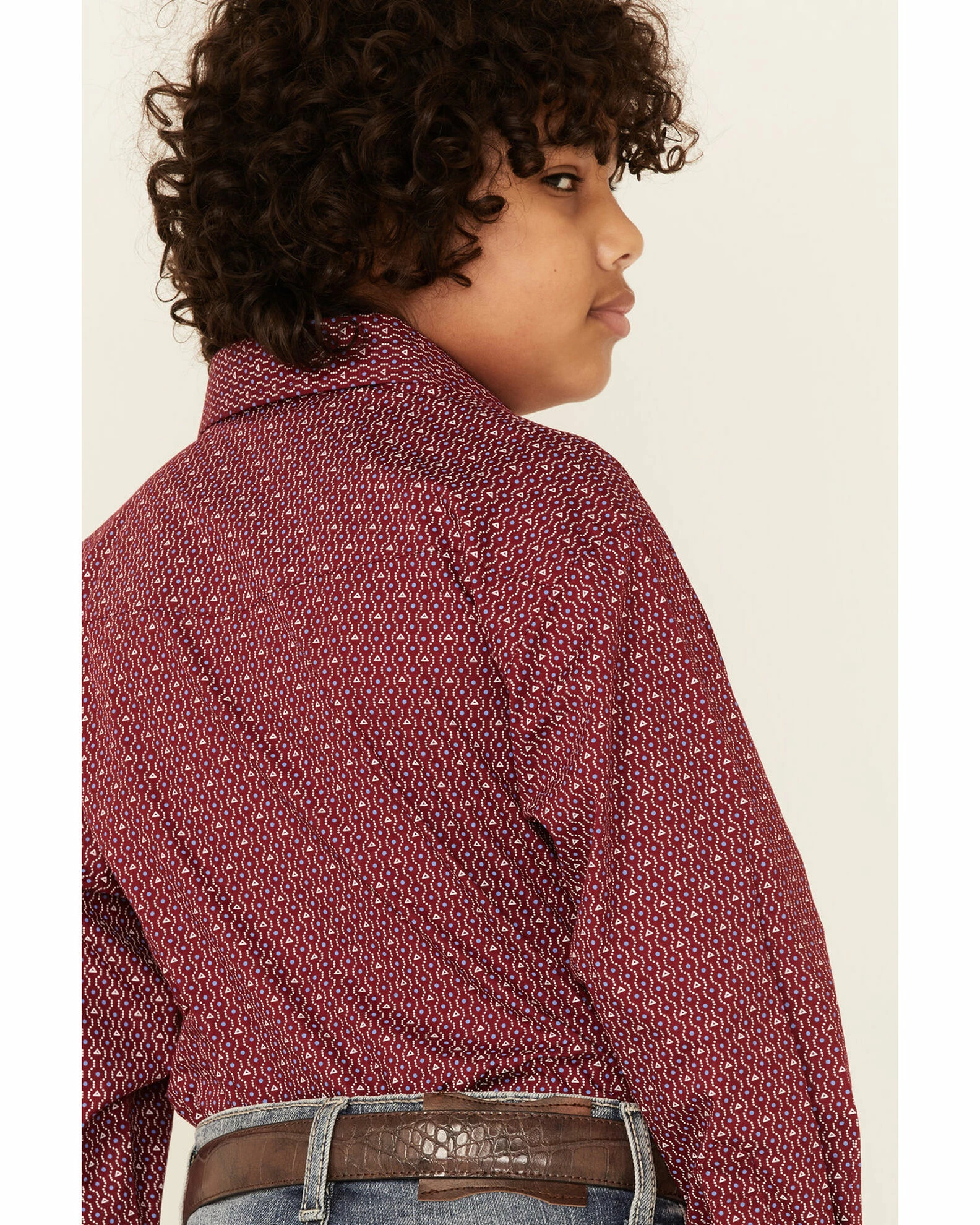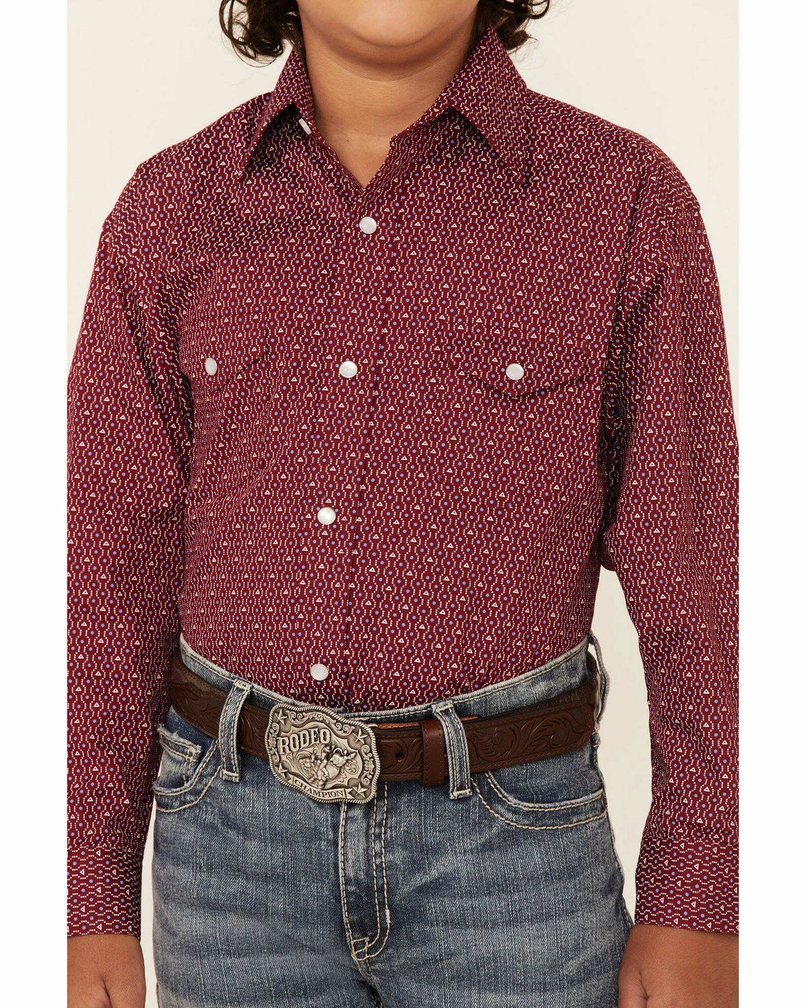 Rough Stock By Panhandle Boys’ Wine Geo Print Long Sleeve Snap Western Shirt Red
