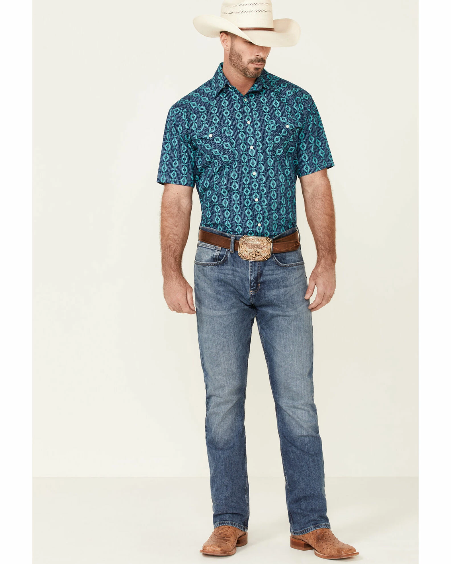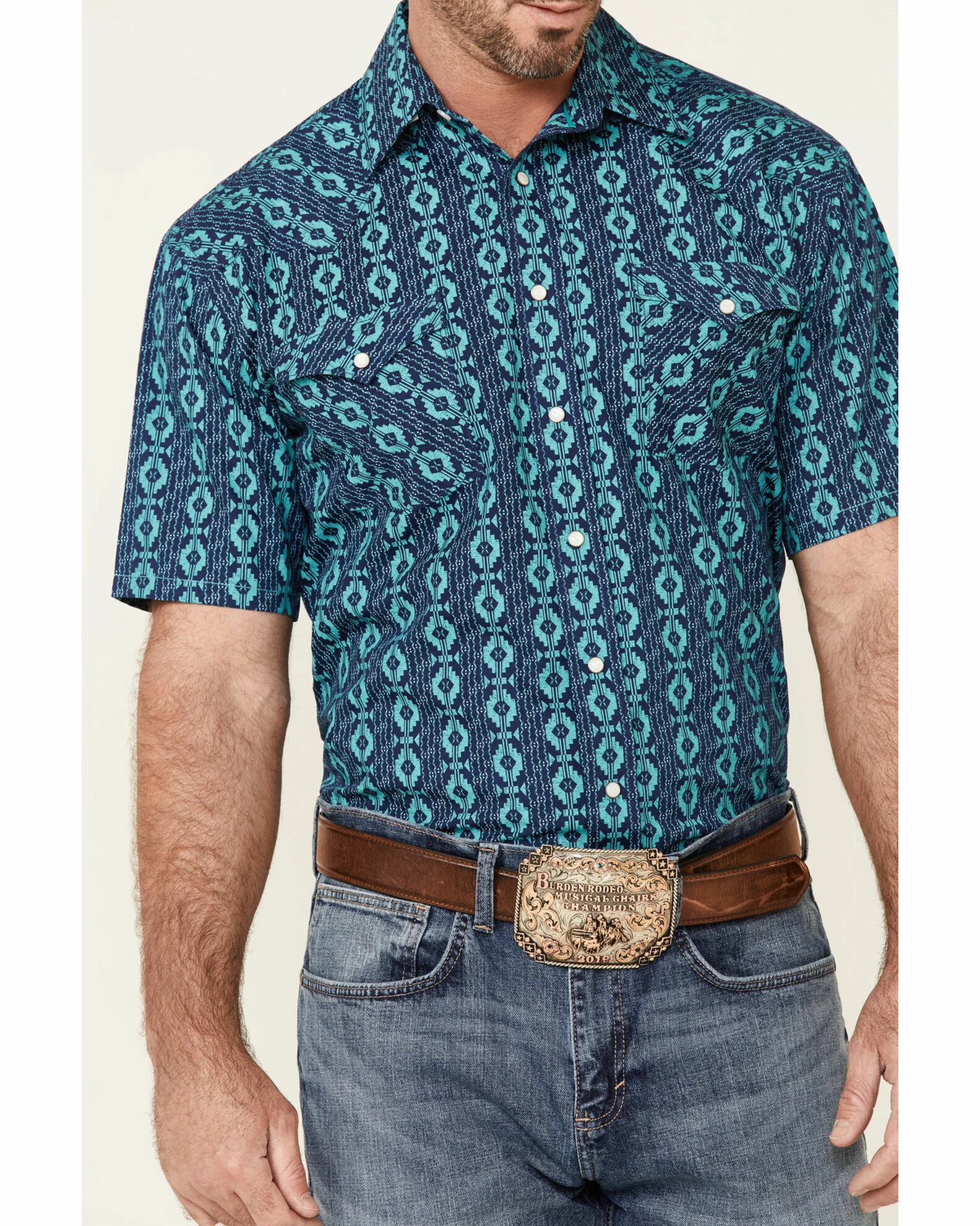 Rough Stock By Panhandle Men’s Large Southwestern Geo Print Short Sleeve Snap Western Shirt Navy