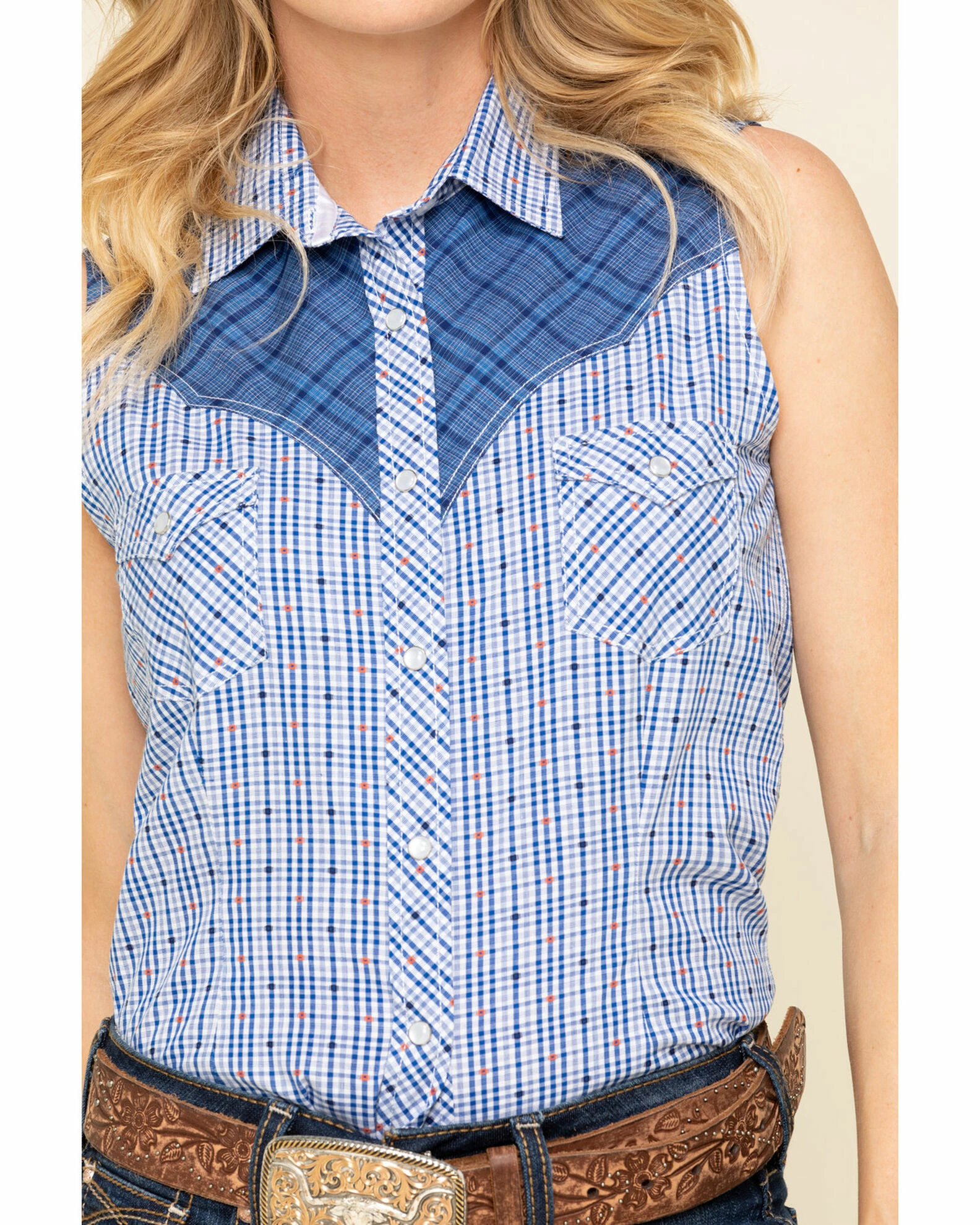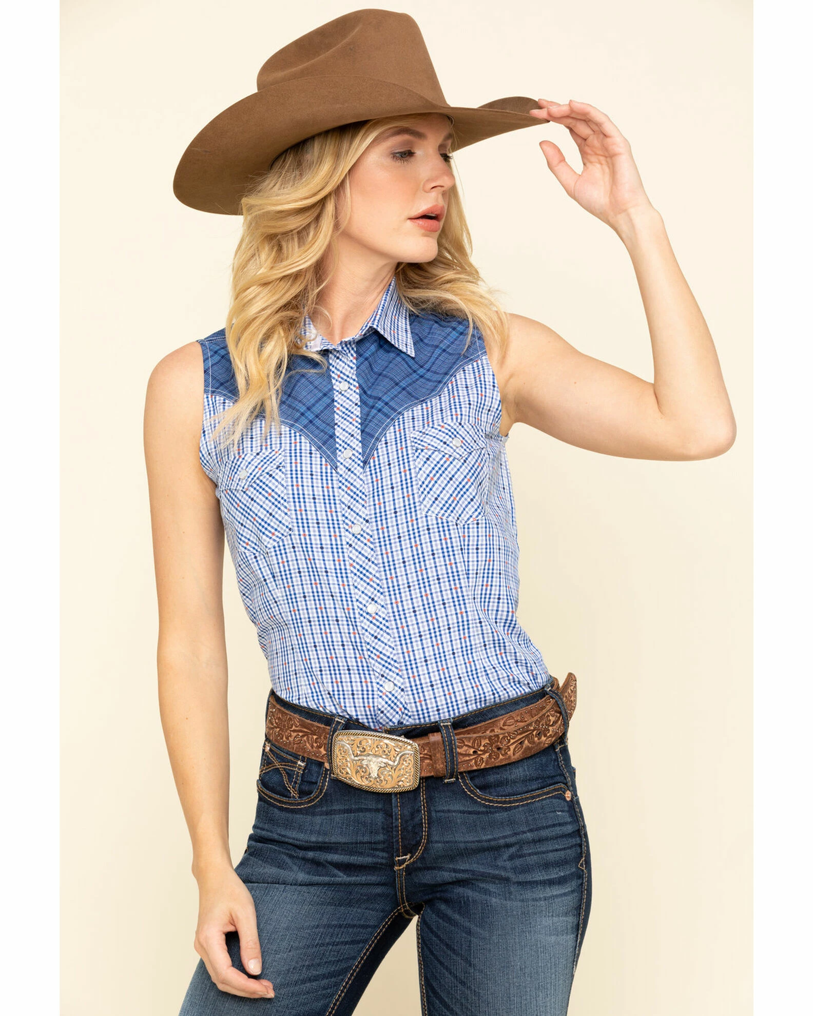 Rough Stock By Panhandle Women’s Check Sleeveless Western Shirt Blue