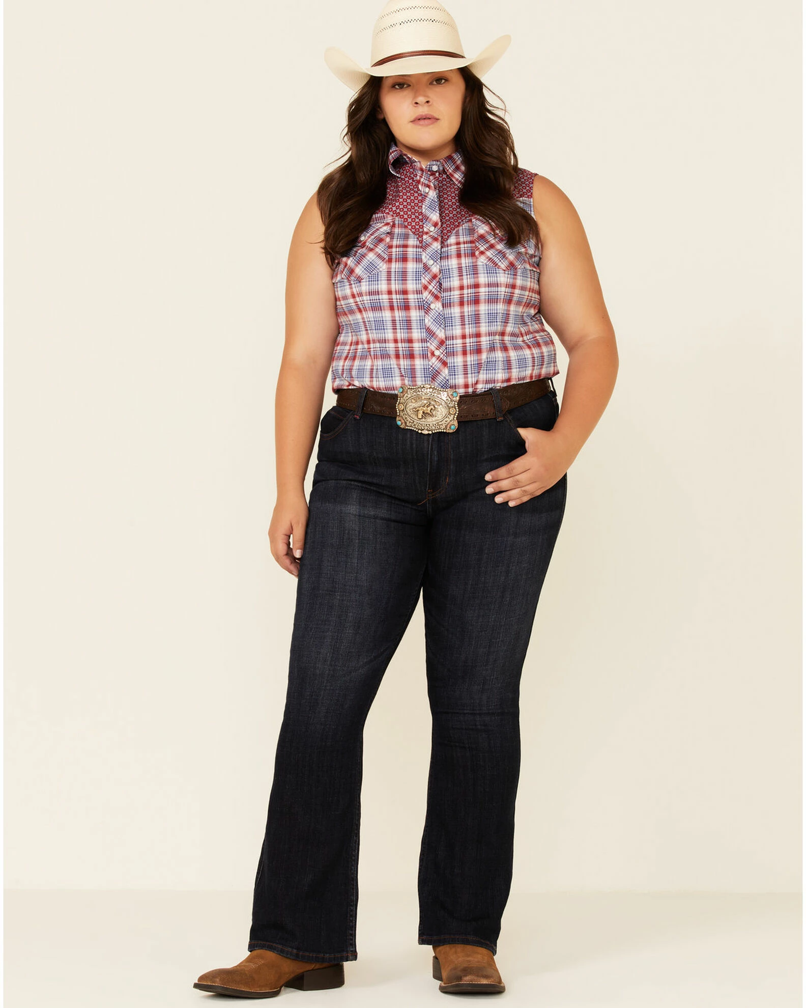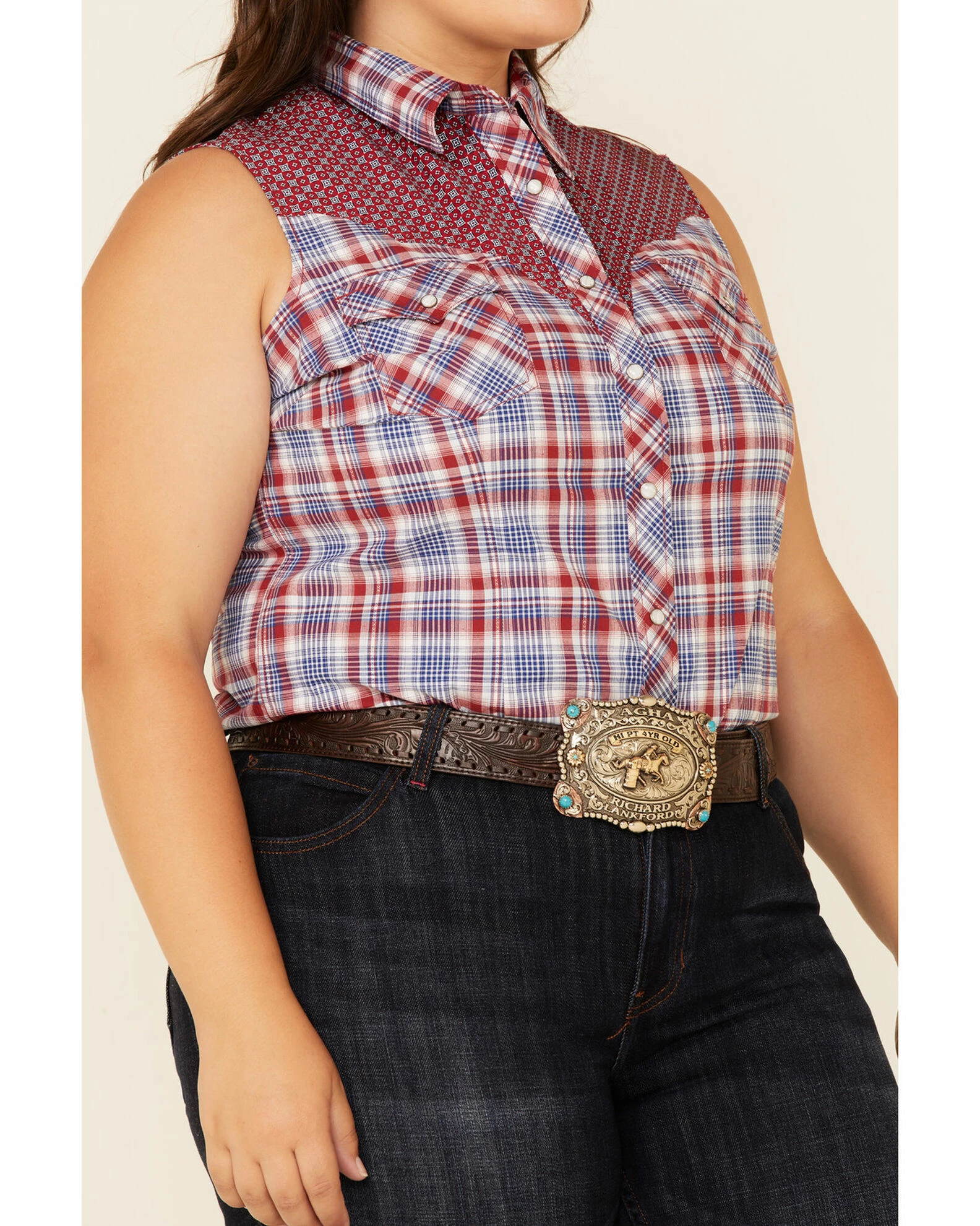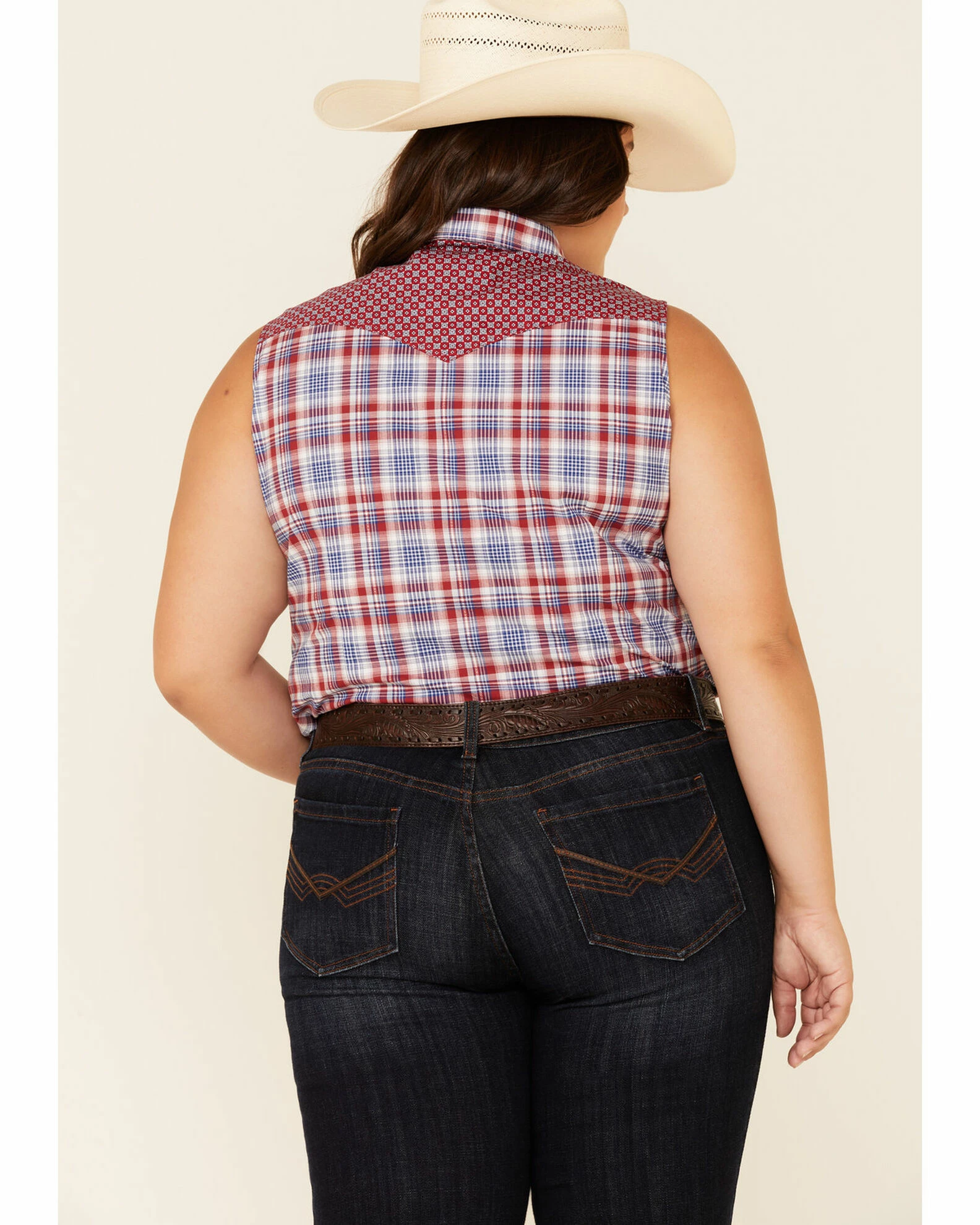 Rough Stock By Panhandle Women’s Multi Plaid Contrast Yoke Sleeveless Snap Western Core Shirt – Plus Red/white/blue