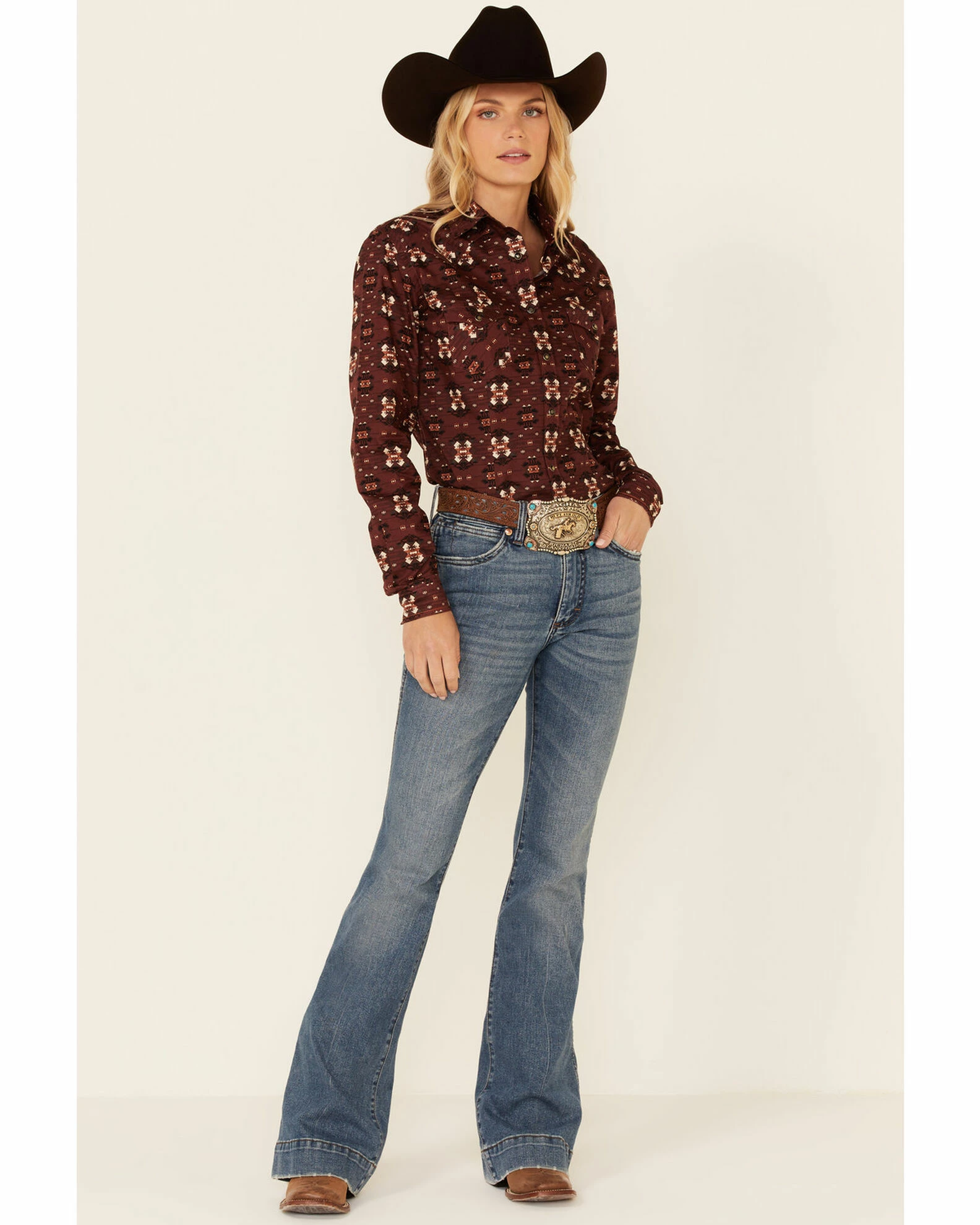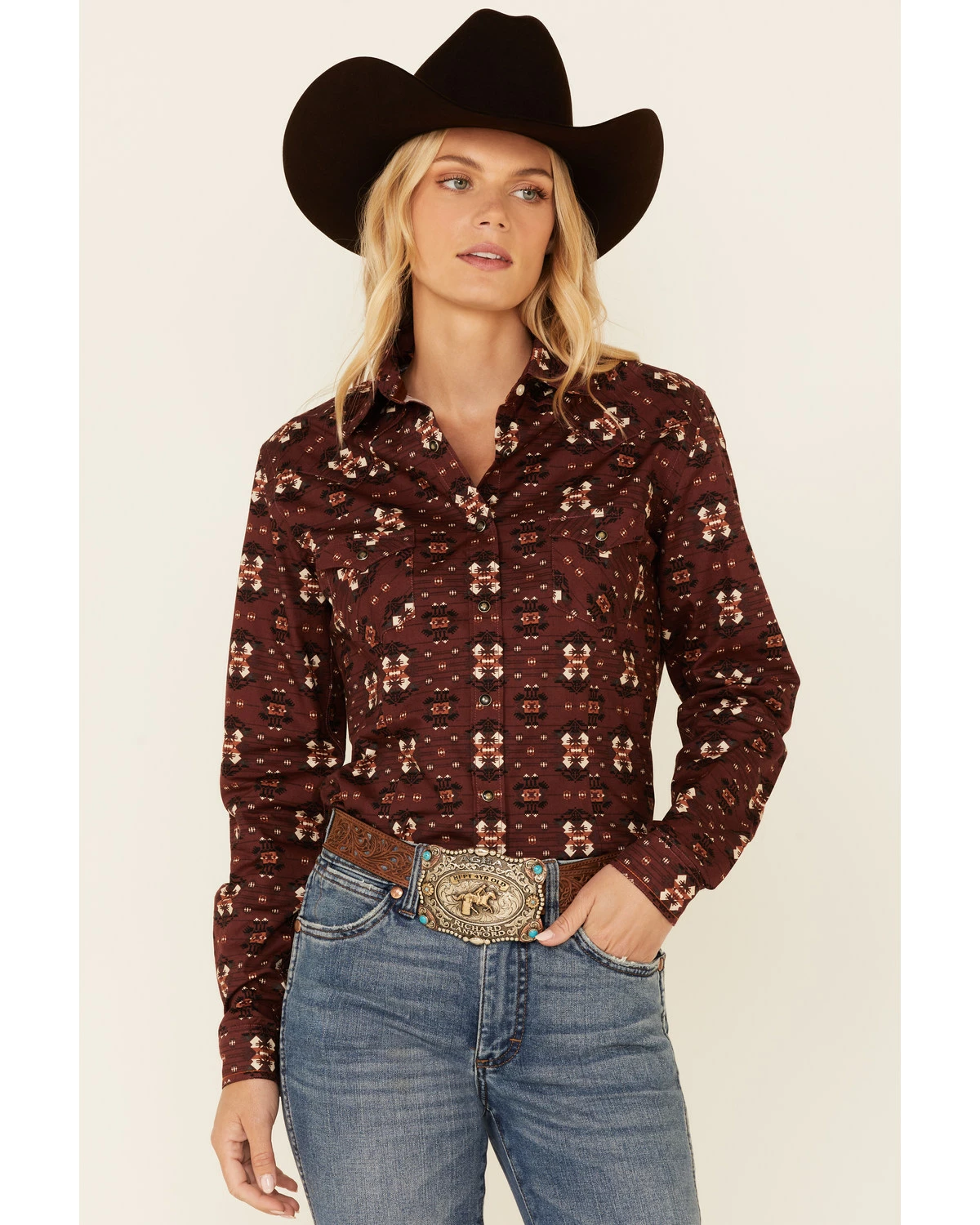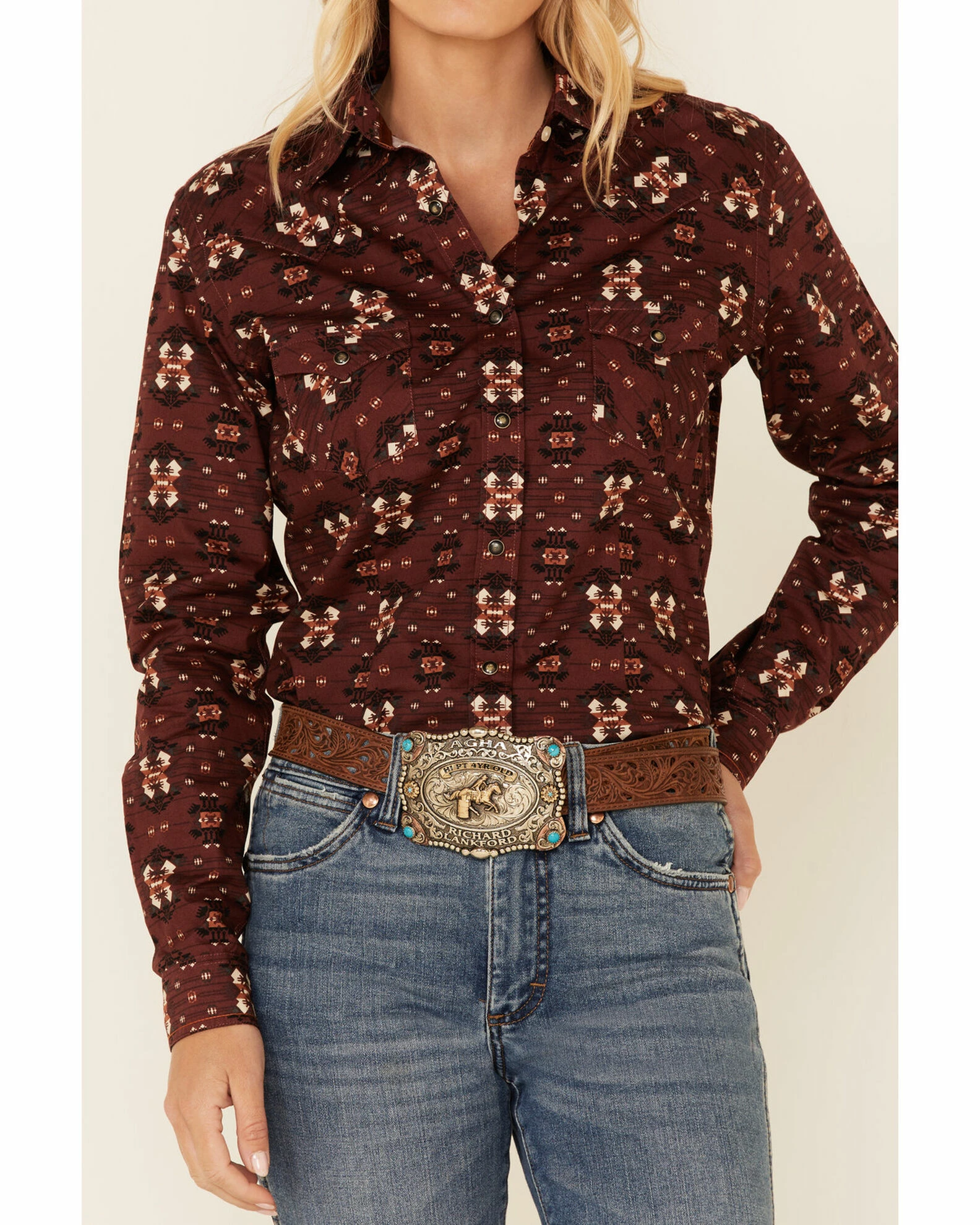 Rough Stock By Panhandle Women’s Rust Copper Southwestern Print Long Sleeve Snap Western Core Shirt