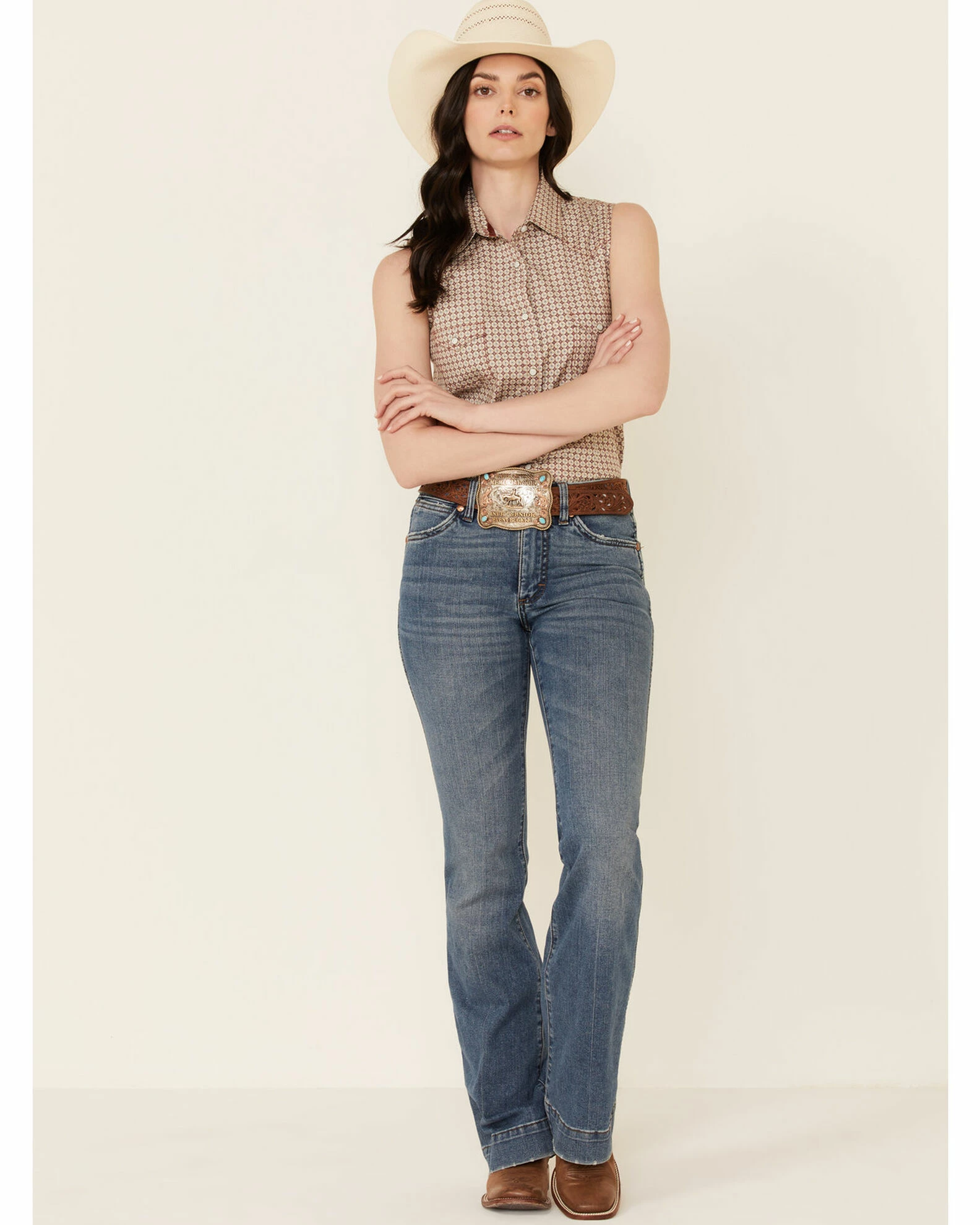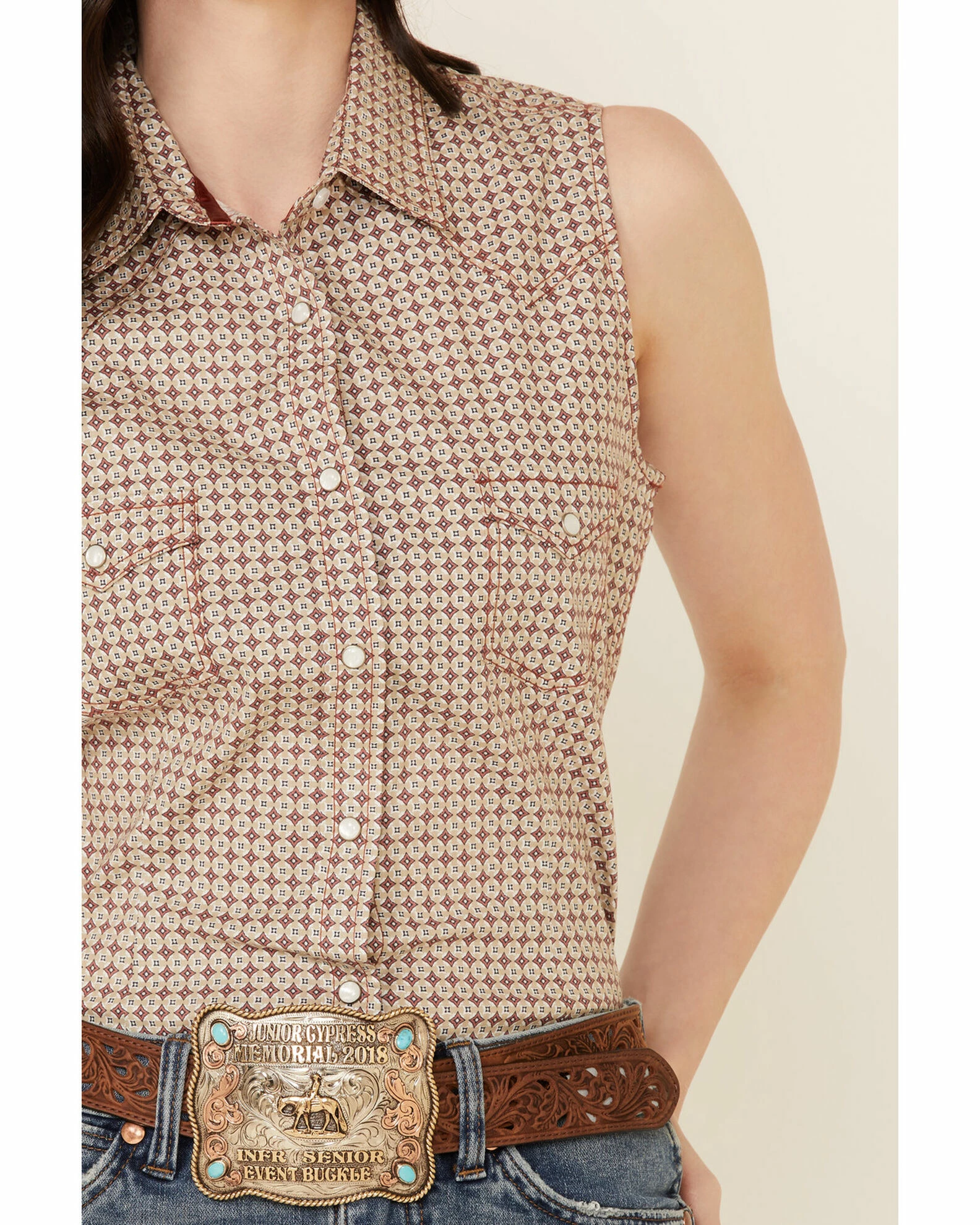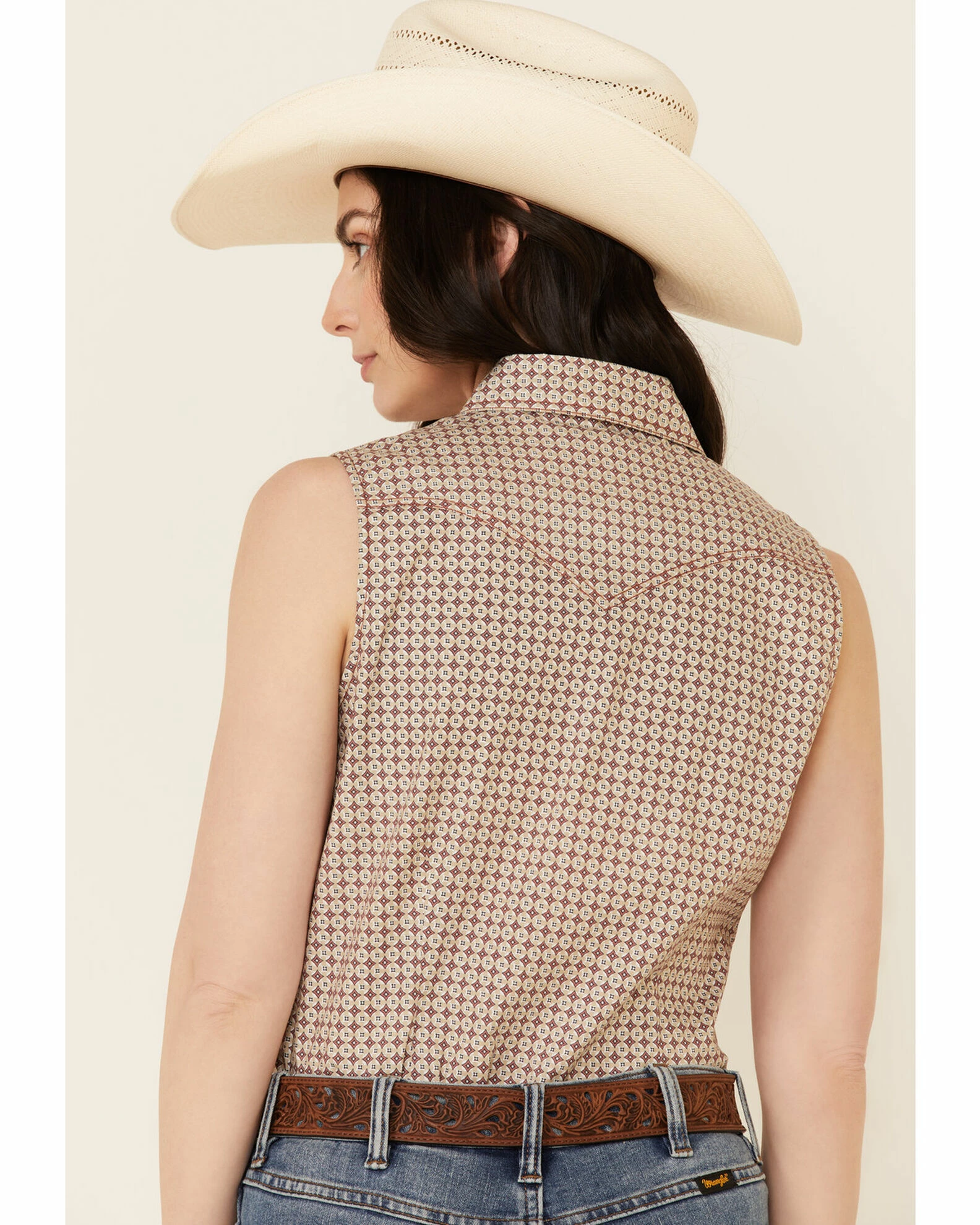 Rough Stock By Panhandle Women’s Tile Geo Print Sleevelees Snap Western Core Shirt Tan