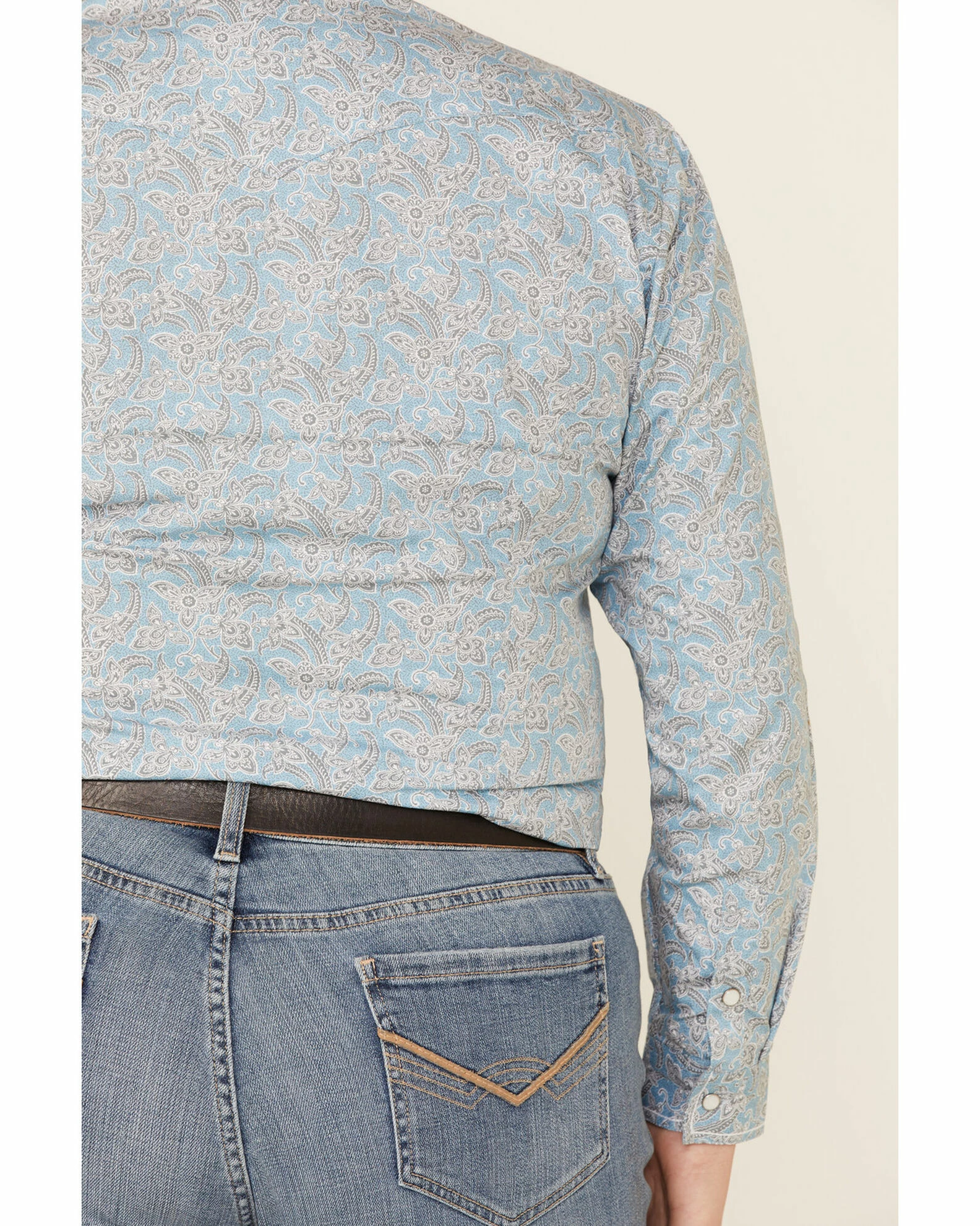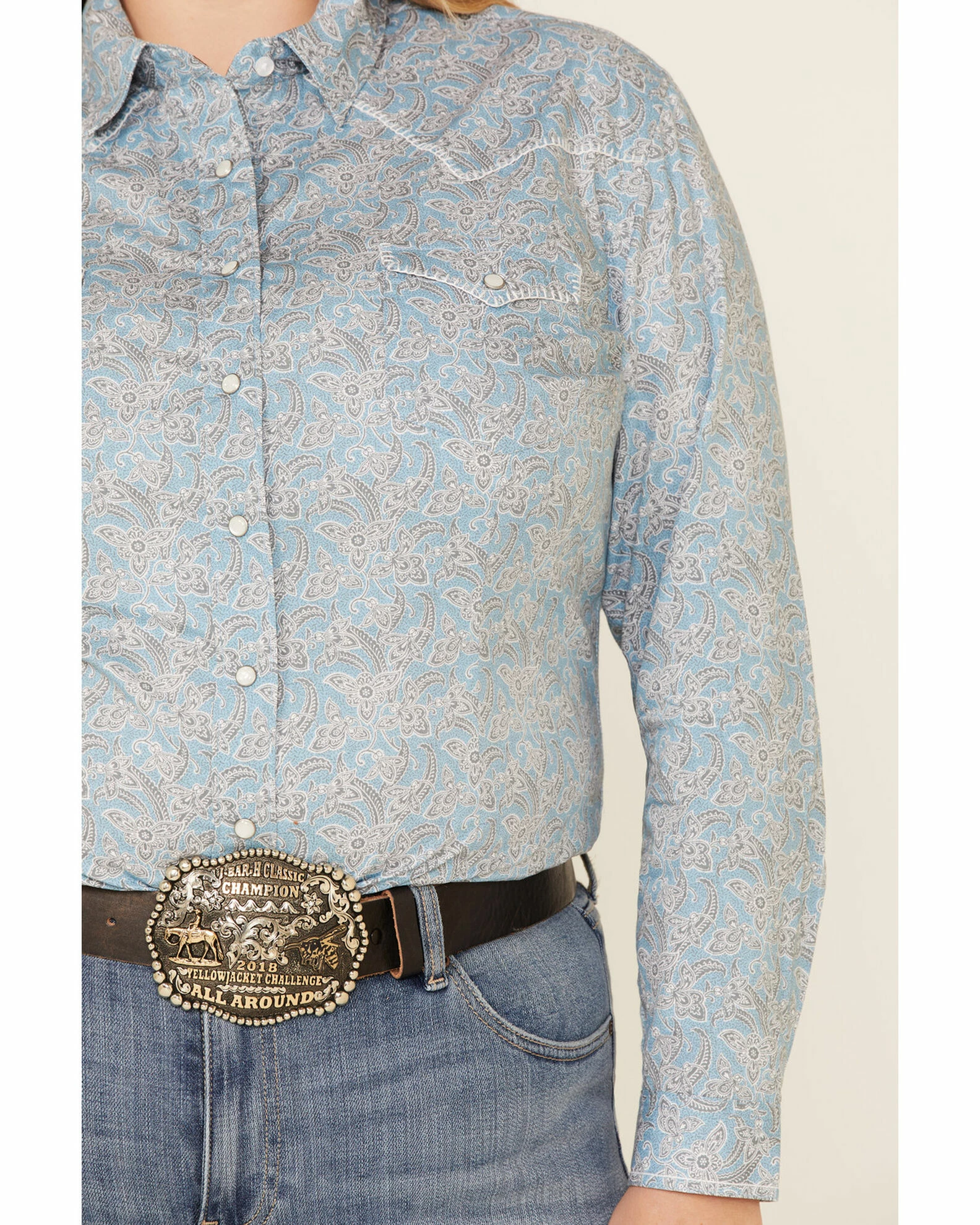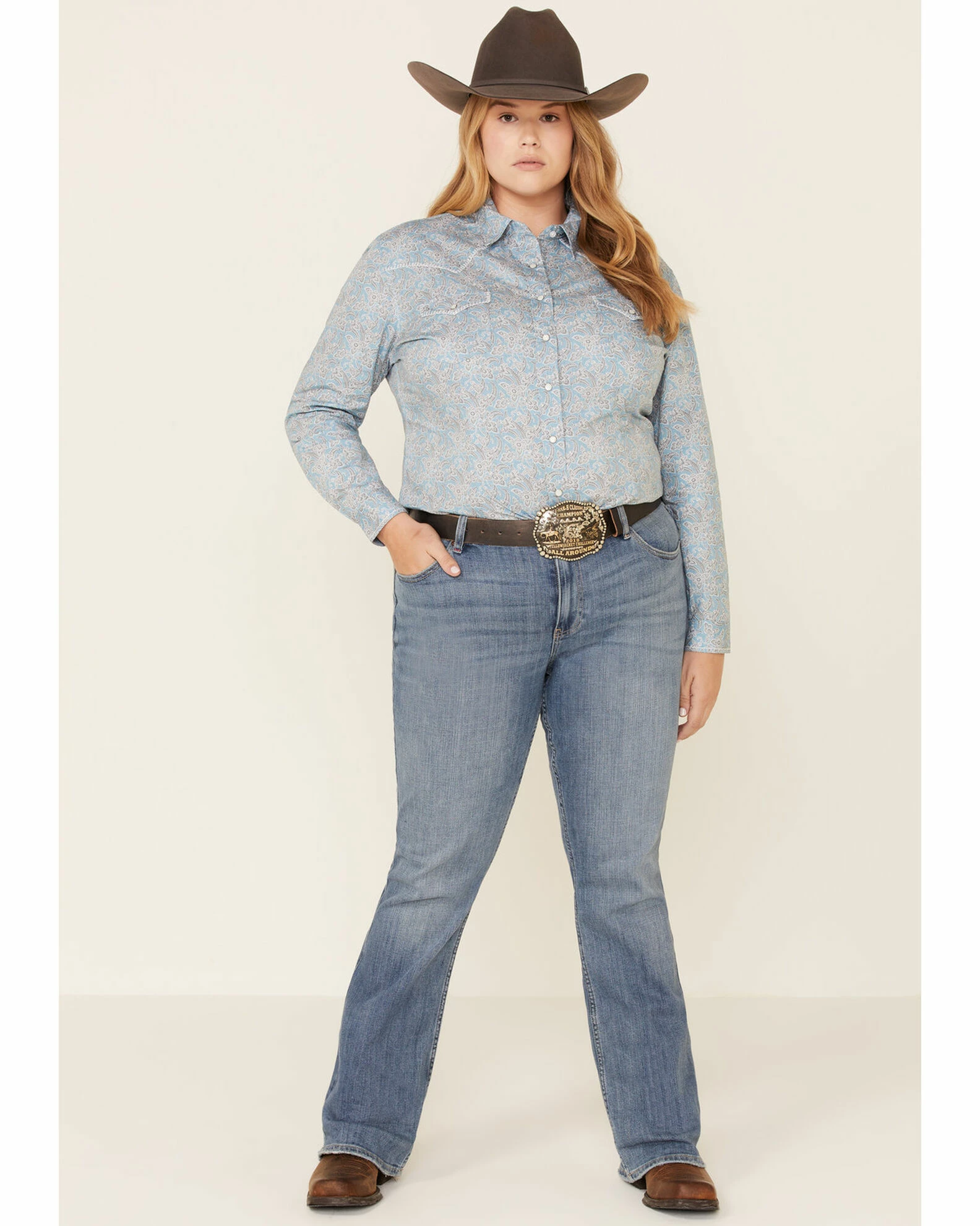 Rough Stock By Panhandle Women’s Vintage Print Snap Long Sleeve Western Shirt – Plus Blue