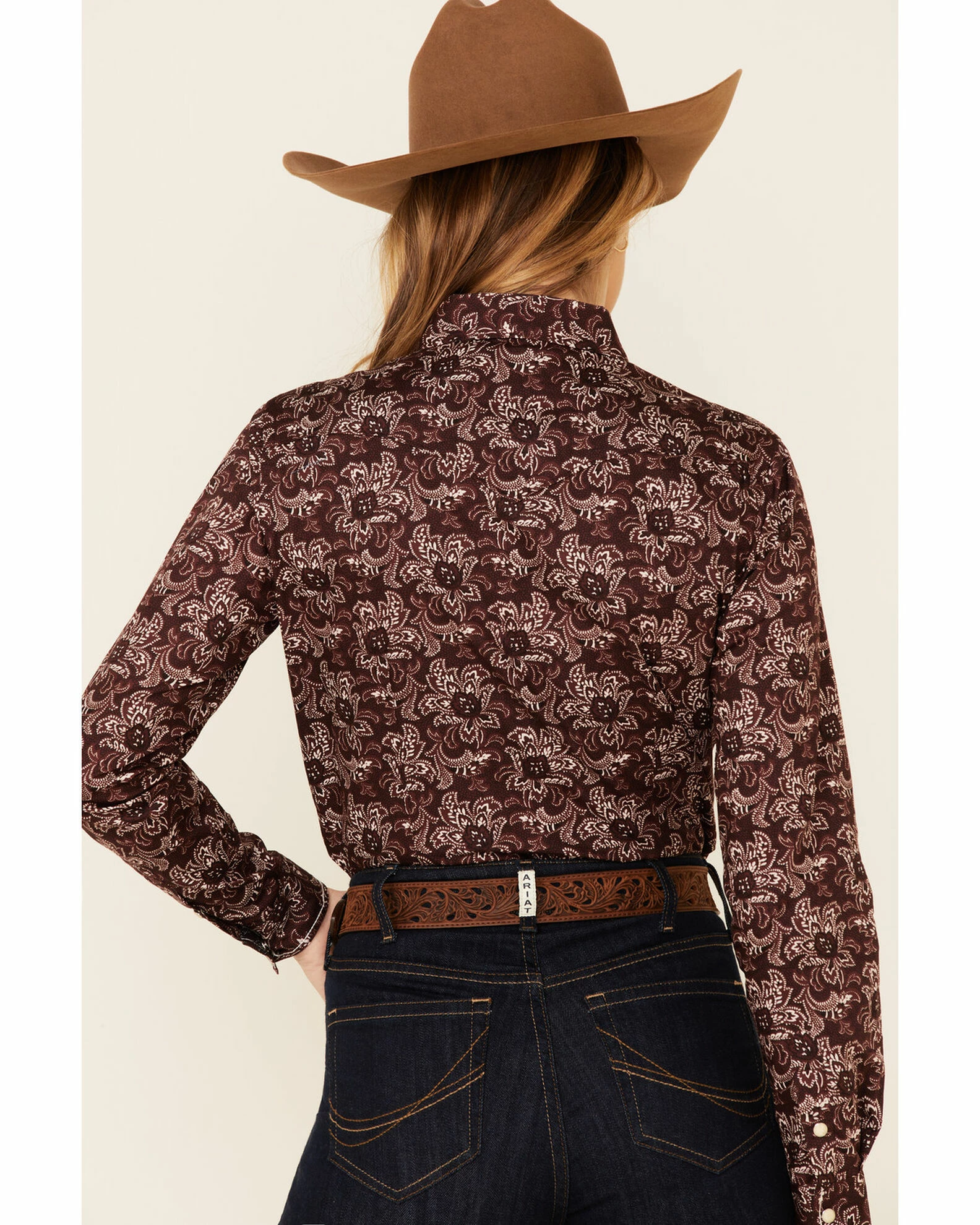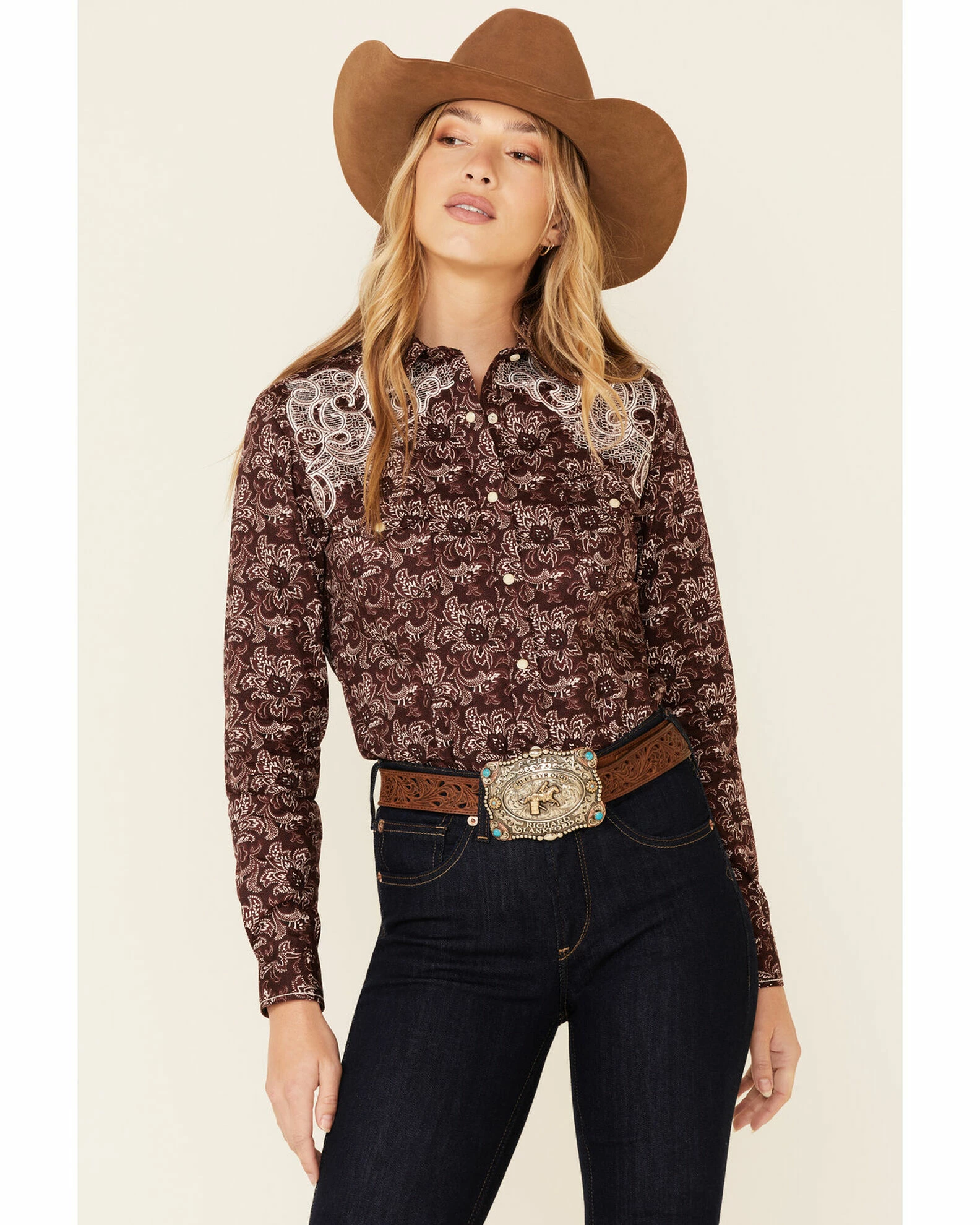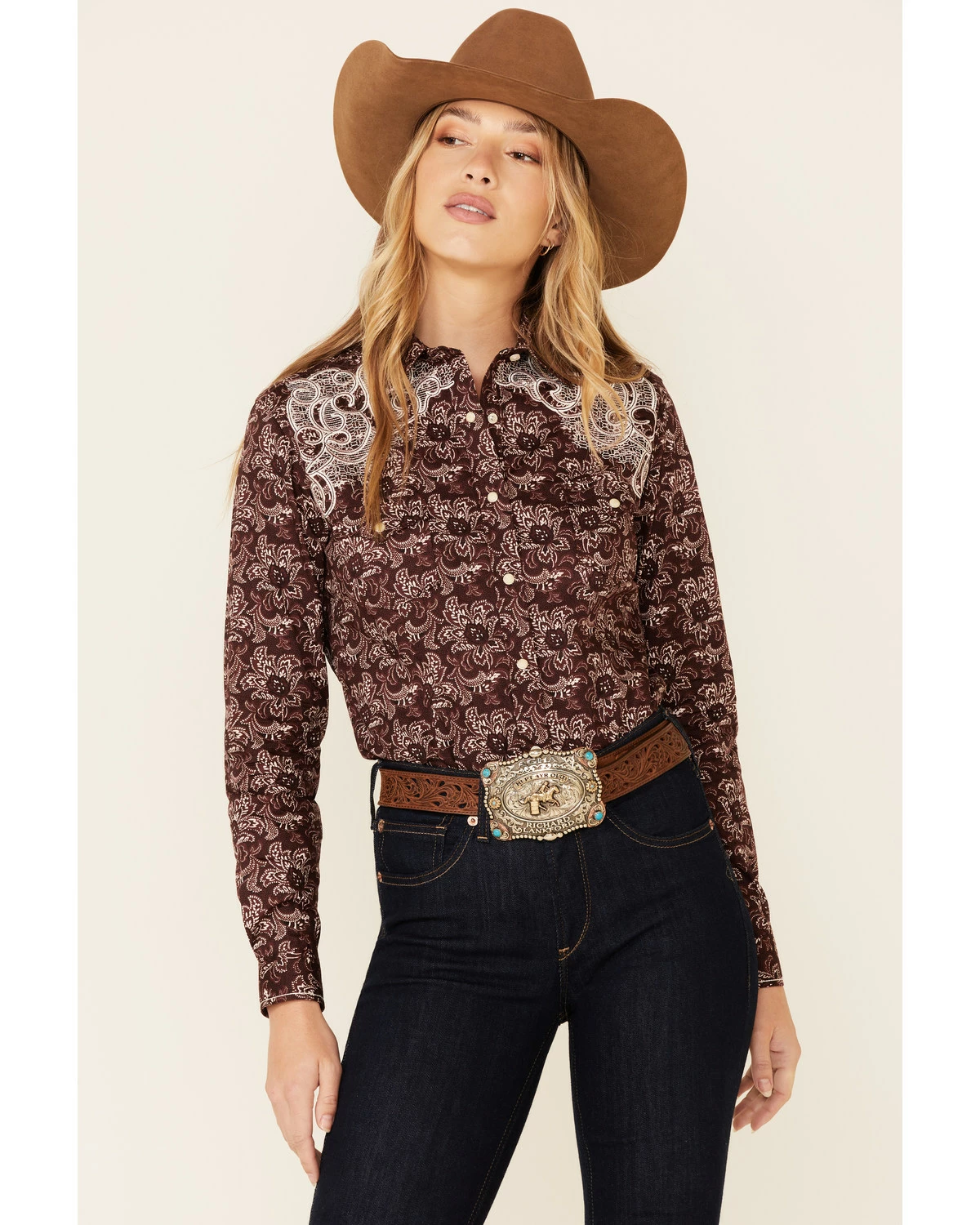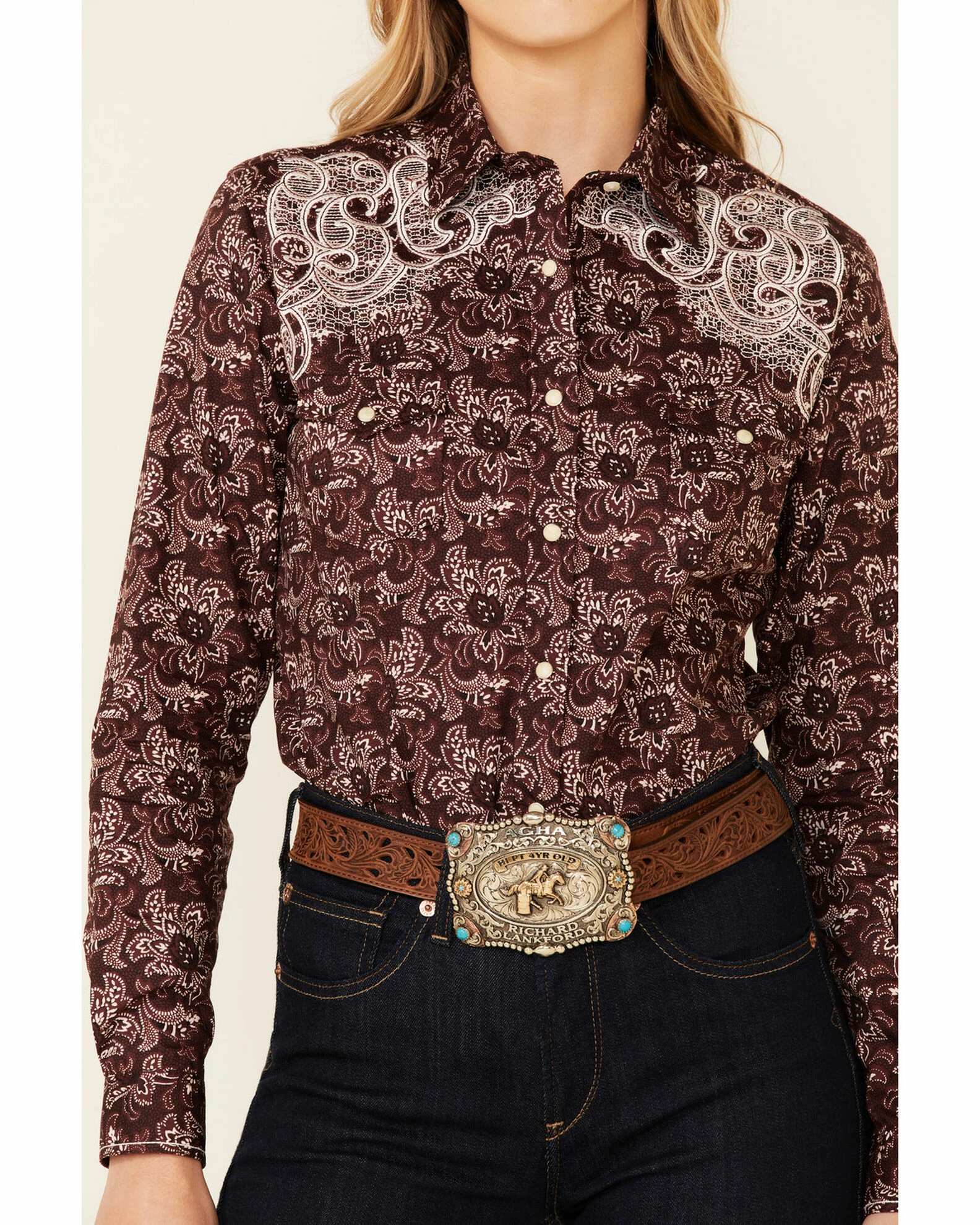 Rough Stock By Panhandle Women’s Wine Floral Print Lace Yoke Long Sleeve Snap Western Core Shirt Burgundy